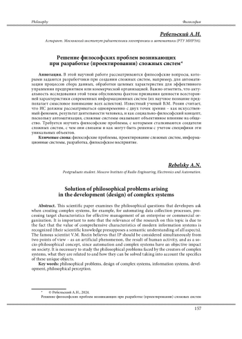 В этой научной работе рассматриваются философские вопросы, которыми задаются разработчики при создании сложных систем, например, для автоматизации процессов сбора данных, обработки целевых характеристик для эффективного управления предприятием или коммерческой организацией. Важно отметить, что актуальность исследования этой темы обусловлена фактом признания ценности всесторонней характеристики современных информационных систем (их научное познание предполагает смысловое понимание всех аспектов). Известный ученый В. М. Розин считает, что ИС должны рассматриваться одновременно с двух точек зрения - как искусственный феномен, результат деятельности человека, и как социально-философский концепт, поскольку автоматизация, сложные системы оказывают объективное влияние на общество. Требуется изучить философские проблемы, с которыми сталкиваются создатели сложных систем, с чем они связаны и как могут быть решены с учетом специфики эти уникальных объектов.