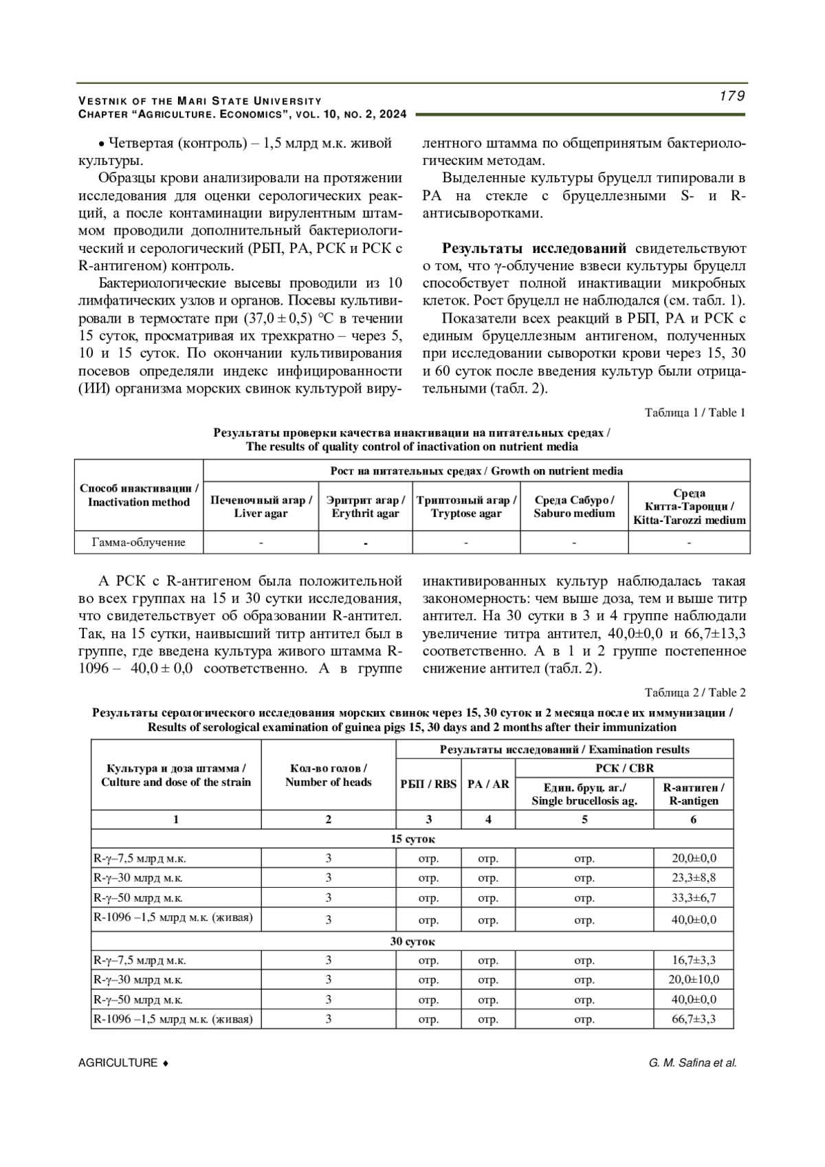 Ведение. Учитывая широкое распространение бруцеллеза, зооноза, вызываемого внутриклеточными факультативными бактериями рода Brucella, поиск экологически безвредных диагностических препаратов становится важной научной задачей. Подчеркивается необходимость разработки инновационных, безопасных для окружающей среды методов диагностики для улучшения контроля и предотвращения распространения бруцеллеза. Практическая значимость исследования заключается в разработке нового метода диагностики бруцеллеза, позволяющего точно выявлять скрытые формы инфекции у животных. Это имеет потенциал значительно улучшить контроль и профилактику бруцеллеза в сельскохозяйственной отрасли, уменьшая экономические потери и угрозы общественному здоровью. Использование инактивированной культуры может обеспечить более безопасный и эффективный подход к вакцинации, снижая риск распространения инфекции и повышая эффективность иммунного ответа у животных. Целью эксперимента было изучение влияния разных доз гамма-инактивированной культуры штамма B. abortus на морских свинках с целью определения их инфекционного статуса. Нами установлено, что оптимальная иммунизирующая доза в 30 млрд м. к. позволяет эффективно выявлять инфицированных животных, не вызывая при этом ложноположительных результатов у здоровых животных. Экспериментальным путем было доказано, что после вакцинации серологические реакции с единым бруцеллезным антигеном оставались отрицательными, данный факт подтверждает потенциал изученной нами культуры в разработке точных методов диагностики бруцеллеза.