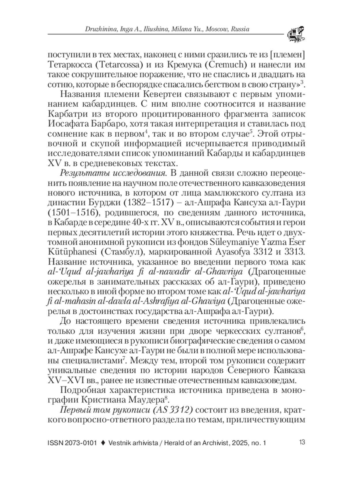 8. Дружинина, И. А., Илюшина, М. Ю., Кабардов, И. Б. Знать и власть в Кабарде XV столетия по сведениям рукописи “Драгоценные ожерелья в достоинствах государства ал-Ашрафа ал-Гаури” // История, археология и этнография Кавказа. 2024. Т. 20. № 4. С. 772-782. EDN: RCFKWZ