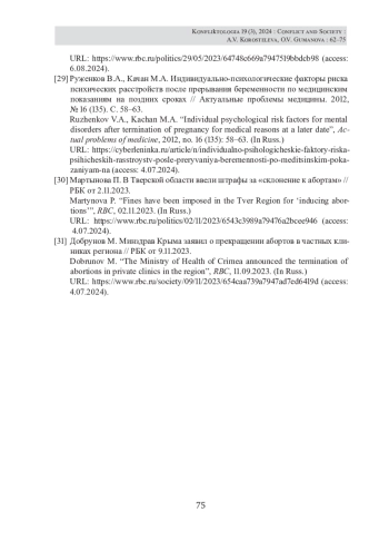 24. Бузлаев П. РПЦ: женщины за 30 более состоятельны и чаще делают аборты в частных клиниках // Коммерсантъ от 8.07.2024 Buzlaev P. “ROC: women over 30 are wealthier and more likely to have abortions in private clinics”, Kommersant, 8.07.2024. (In Russ.) URL: https://www.kommersant.ru/doc/6820092 (access: 6.08.2024).