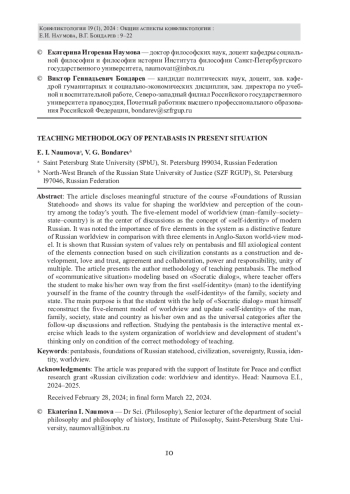 Статья раскрывает смысловую структуру курса «Основы российской государственности» и показывает его значение для формирования мировоззрения и представления о своей стране у современной молодежи. В центре рассмотрения находится пятиэлементная модель мировоззрения (человек-семья-общество-государство-страна) как концепция «я-идентичности» современного россиянина. Отмечено значение системного момента в виде пяти элементов в качестве отличительной особенности российского мировоззрения в сравнении с англо-саксонской моделью, где преобладает трехэлементная модель. Показано, что российская система ценностей опирается на пентабазис, при этом аксиологическое содержание взаимосвязи его элементов формируется на основе таких цивилизационных констант как созидание и развитие, любовь и доверие, согласие и сотрудничество, сила и ответственность, единство многообразия. Представлена авторская методика преподавания пентабазиса. Метод моделирования «коммуникативной ситуации» строится на основе «Сократической беседы», где преподаватель предлагает студенту пройти собственный путь от первичной «я-идентичности» (человек) к самоопределению себя в рамках страны через «я-идентичности» семьи, общества и государства. Основная задача заключается в том, чтобы студент с помощью беседы с учителем сам реконструировал пятиэлементную модель мировоззрения и актуализировал «я-идентичности» человека, семьи, общества, государства и страны в качестве собственных, а в ходе последующих обсуждений и рефлексии в качестве универсальных категорий. Изучение пятиэлементной модели мировоззрения представлено как интерактивное ментальное упражнением, которое, при правильной методологии преподавания, выполняет функцию системной организации мировоззрения и развития мышления у студента.