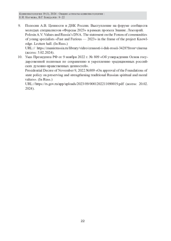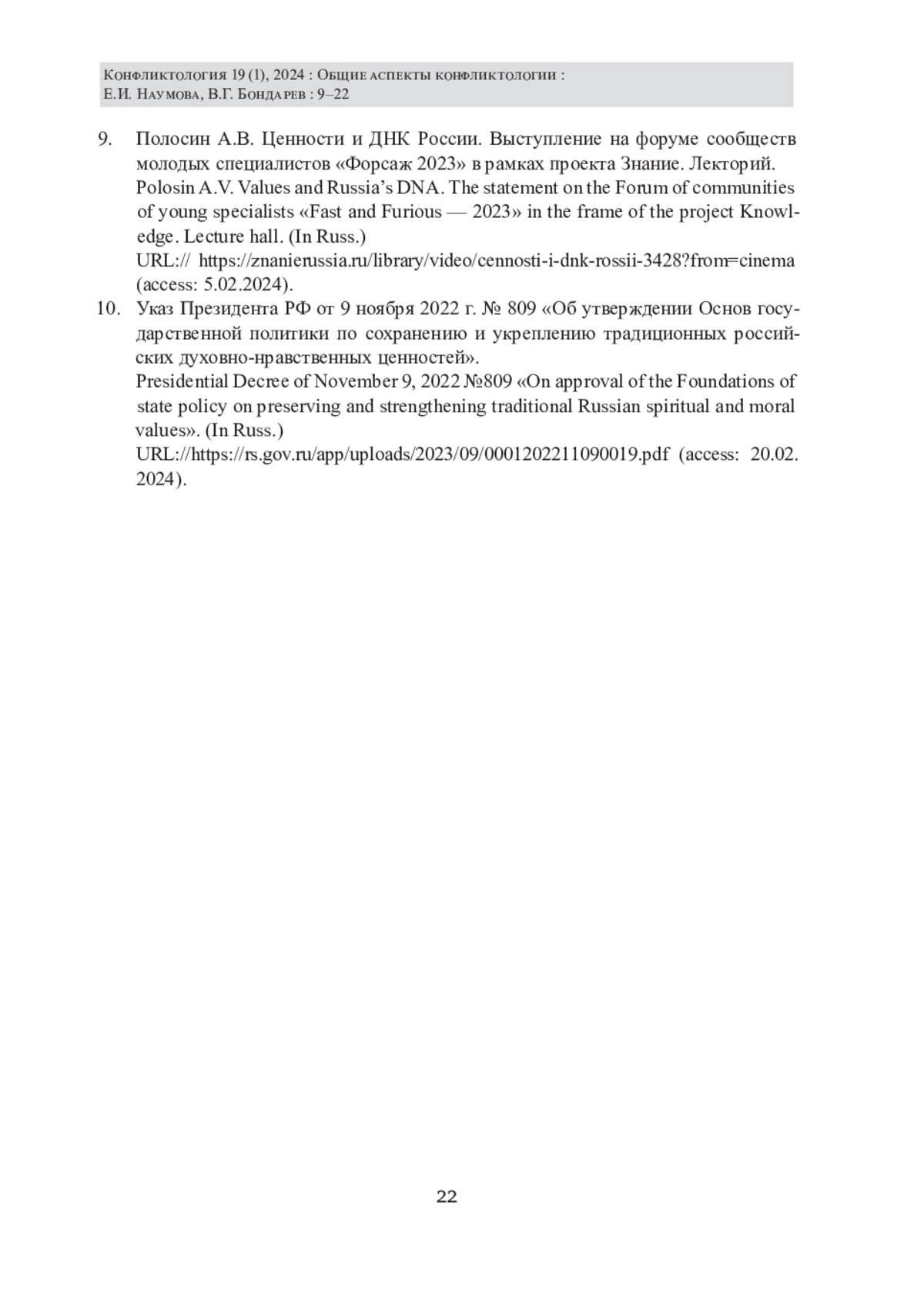 10. Указ Президента РФ от 9 ноября 2022 г. № 809 “Об утверждении Основ государственной политики по сохранению и укреплению традиционных российских духовно-нравственных ценностей”. URL://https://rs.gov.ru/app/uploads/2023/09/0001202211090019.pdf (access: 20.02.2024).