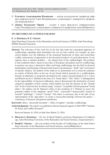 ЧЕРНОВ Д. Е., ИЛЬИНСКАЯ Е. А. К ВОПРОСУ ОБ ЭТИКЕ КОНФЛИКТОЛОГА // КОНФЛИКТОЛОГИЯ. 2024. Т. 19 № 1