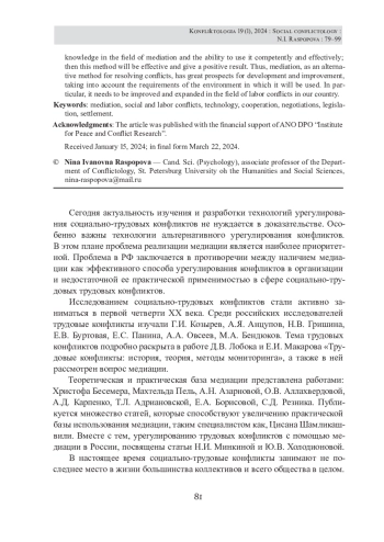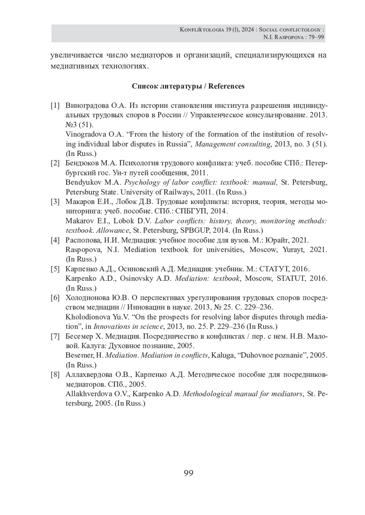 6. Холодионова Ю.В. О перспективах урегулирования трудовых споров посредством медиации // Инновации в науке. 2013, № 25. С. 229-236. EDN: RCOYWF