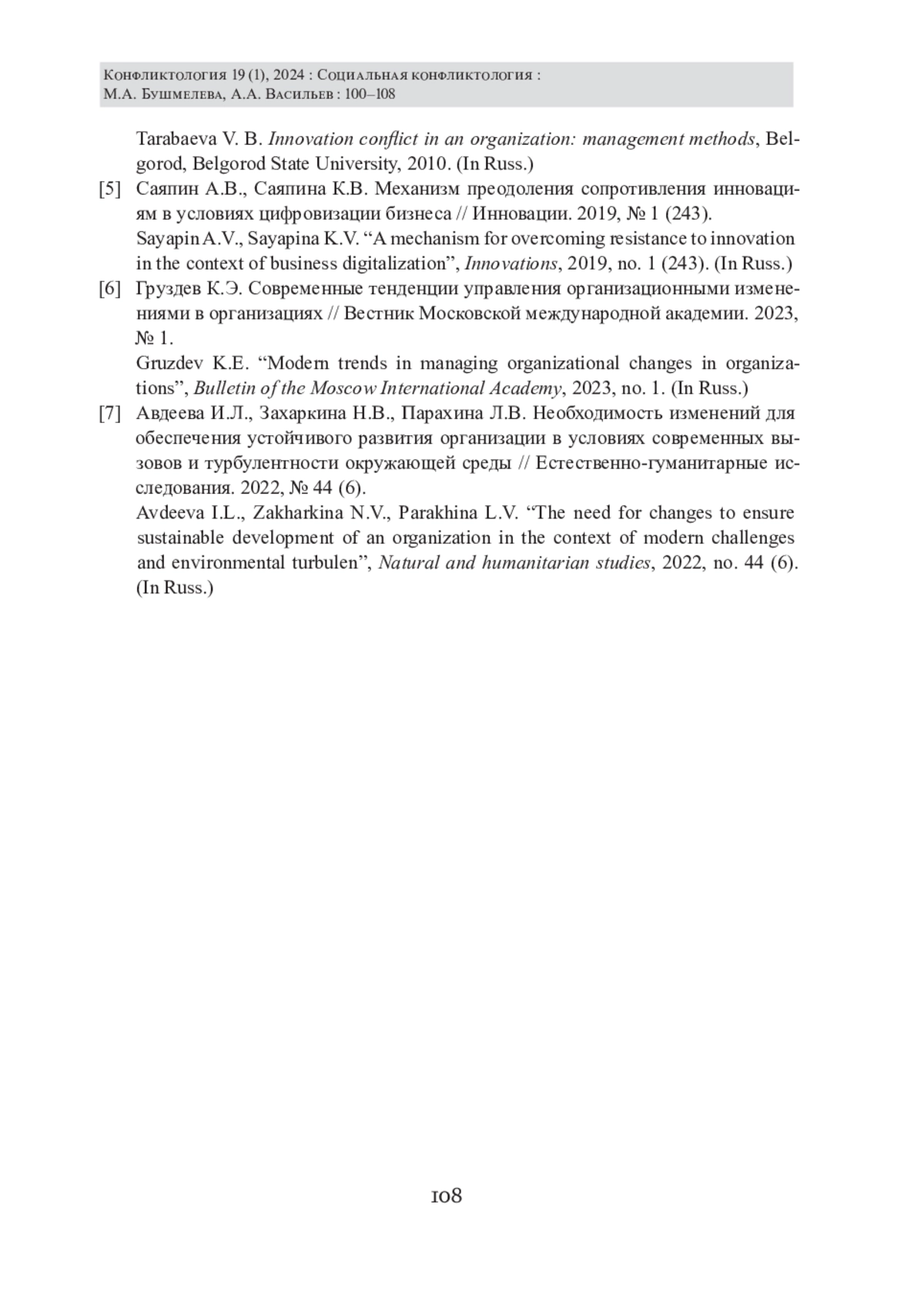 4. Тарабаева В. Б. Инновационный конфликт в организации: методы управления. Белгород: Белгородский государственный университет, 2010. EDN: KBQXNL