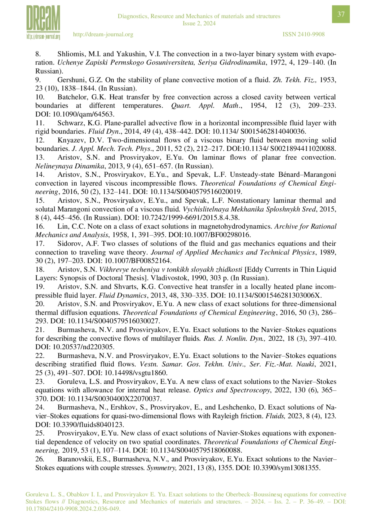 29. Горулева Л. С., Просвиряков Е. Ю. Новый класс точных решений уравнений магнит-ной гидродинамики для описания конвективных течений бинарных жидкостей // Химическая физика и мезоскопия. – 2023. – Т. 25, № 4. – С. 447–462. – DOI: 10.15350/17270529.2023.4.39.