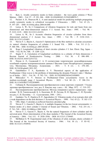 11. Kari, L. Axially symmetric modes in finite cylinders – the wave guide solution // Wave Motion. – 2003. – Vol. 37. – P. 191–206. – DOI: 10.1016/S0165-2125(02)00070-7.