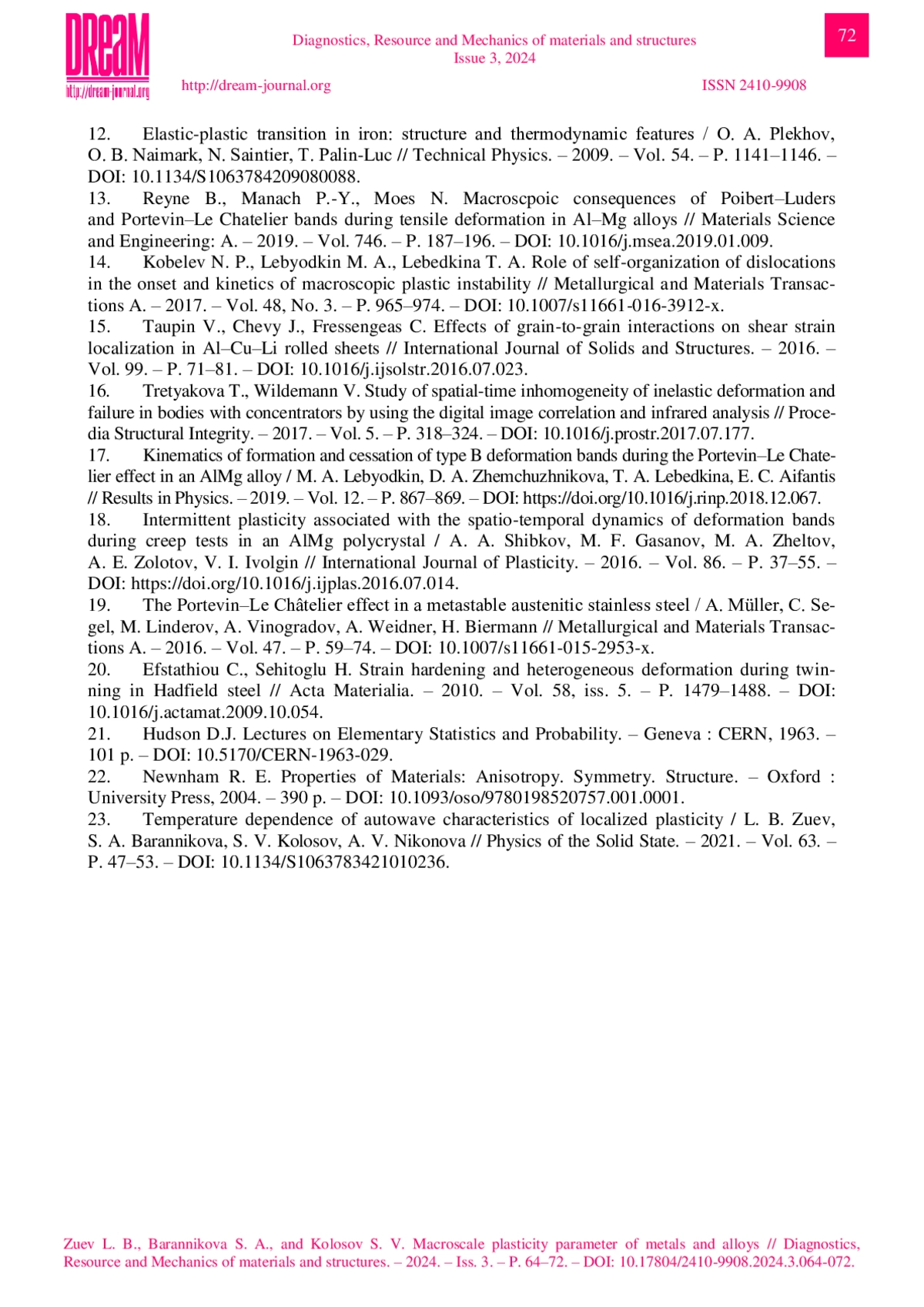9. Zuev L. B., Barannikova S. A. Quasi-particle approach to the autowave physics of metal plasticity // Metals. – 2020. – Vol. 10 (11). – P. 1–15. – DOI: 10.3390/met10111446.