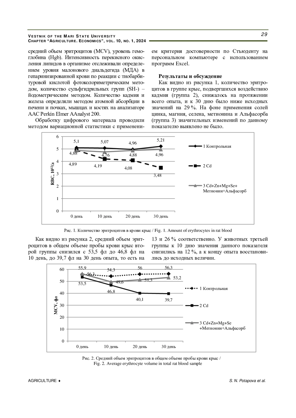 ПОТАПОВА С. Н., КАДИКОВ И. Р., КУРШАКОВА Е. И., САГДЕЕВ Д. Р. ПРИМЕНЕНИЕ ЭССЕНЦИАЛЬНЫХ ЭЛЕМЕНТОВ, МЕТИОНИНА И АЛЬФАСОРБА ПРИ АНЕМИИ ЖИВОТНЫХ, ИНДУЦИРОВАННОЙ КАДМИЕМ // ВЕСТНИК МАРИЙСКОГО ГОСУДАРСТВЕННОГО УНИВЕРСИТЕТА. СЕРИЯ: СЕЛЬСКОХОЗЯЙСТВЕННЫЕ НАУКИ. ЭКОНОМИЧЕСКИЕ НАУКИ. 2024. Т. 10 № 1 (37)