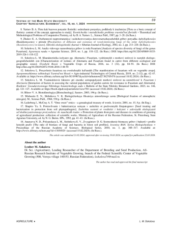 12. Соколова Л. М. Проявление фузариоза на овощных культурах. // Агропромышленные технологии Центральной России. 2019. № 2 (12). С. 42-47. URL: item.asp?id=38319907&ysclid=lu0ummwd27382705478 (дата обращения: 18.02.2024). EDN: LZMNHU