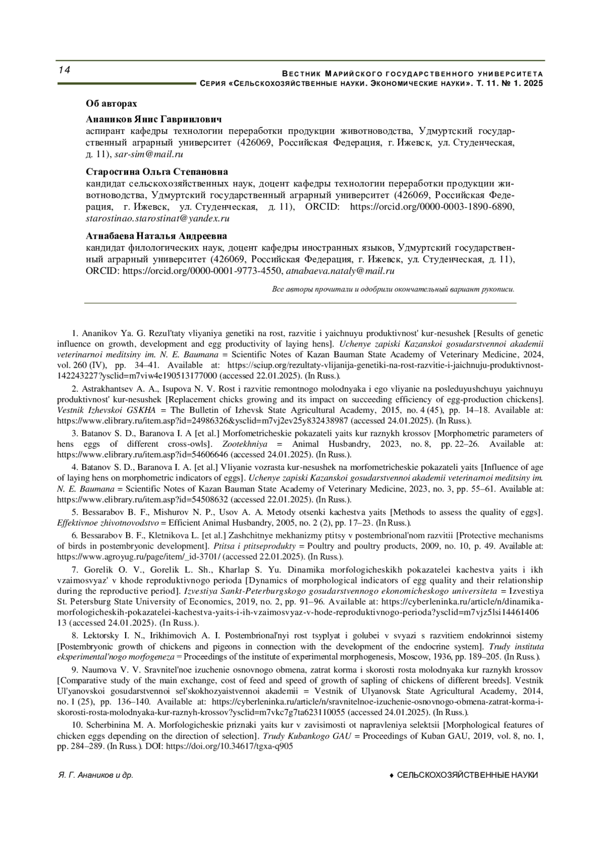 2. Астраханцев А. А., Исупова Н. В. Рост и развитие ремонтного молодняка и его влияние на последующую яичную продуктивность кур-несушек // Вестник Ижевской ГСХА. 2015. № 4 (45). С. 14-18. URL: https://www.elibrary.ru/item.asp?id=24986326&ysclid=m7vj2ev25y832438987 (дата обращения: 24.01.2025).