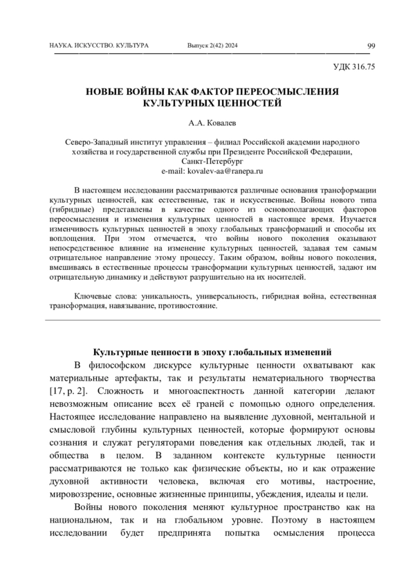 В настоящем исследовании рассматриваются различные основания трансформации культурных ценностей, как естественные, так и искусственные. Войны нового типа (гибридные) представлены в качестве одного из основополагающих факторов переосмысления и изменения культурных ценностей в настоящее время.