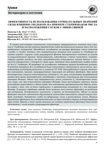 В статье рассмотрена возможность использования отрицательных значений силы влияния h2 Снедекора как для решения практических задач дисперсионного анализа, так и для теоретических построений. Проведенное исследование на примере факторов «число потомков в гнезде» и «гнездо» показало, что отрицательные значения силы влияния h2 Снедекора являются нормой в случаях, когда регулируемый фактор дисперсионного комплекса не влияет на результативный признак. Закономерности, наблюдаемые в таких комплексах, соответствуют нулевой гипотезе, то есть принадлежности используемого массива данных к генеральной совокупности, в которой hx2 равен нулю. Авторами была разработана ошибка выборки для hx2 Снедекора. Её апробация на исследуемом материале прошла достаточно успешно. В качестве материала для исследований были использованы лабораторные мини-свиньи, принадлежащие институту цитологии и генетики СО РАН. Непосредственно изучали многоплодие свиноматок, признак, преимущественно зависящий от средовых факторов. При оценке достоверности, отличия положительных значений h2 от нуля, использование разработанной ошибки дало оценки достоверности совпадающие с оценками, полученными при использовании критерия Фишера. Однако при отрицательных малых значениях h2 достоверности оказались выше, чем при использовании критерия Фишера. Были рассмотрены причины такого расхождения результатов и сделан вывод, что повышенная чувствительность данного метода связана с тем, что он более «приближен» к оцениваемому показателю hj, чем критерий Фишера. В процессе апробации метода была выявлена сила влияния факторов, не учтённых при построении дисперсионных комплексов, и оценена их достоверность. Одним из таких факторов оказалось генетически обусловленное многоплодие свиноматок, которое влияло (следует заметить, достаточно слабо) на субпризнаки числа и расположения сосков. Вторым неучтённым фактором была гетерозиготность по двум-четырём локусам, контролирующим пары сосков. Причём в этом случае, величина сил влияния неучтённых факторов была вполне сопоставима с силой влияния регулируемого фактора.