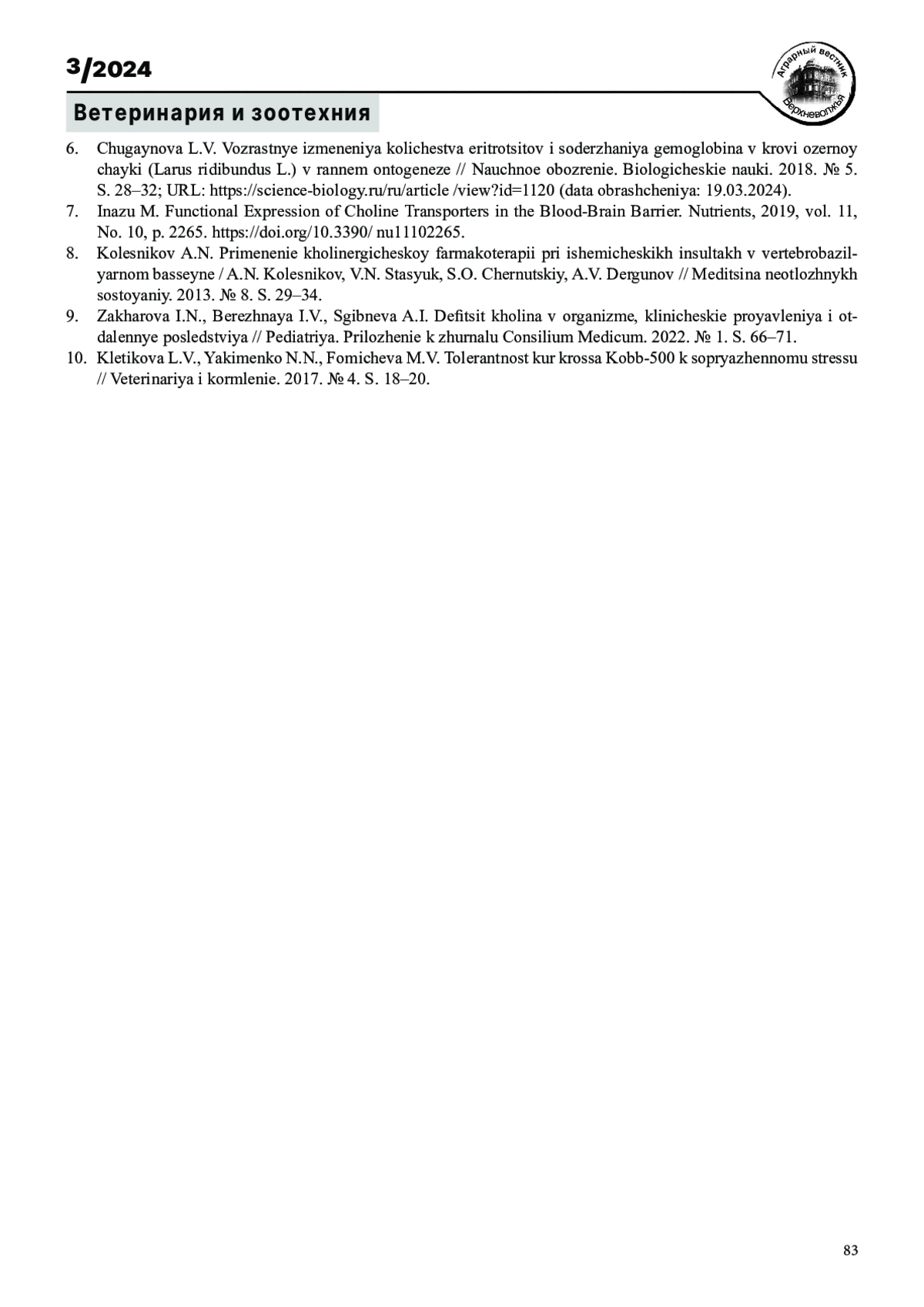 7. Inazu M. Functional Expression of Choline Transporters in the Blood-Brain Barrier. Nutrients, 2019, vol. 11, No. 10, p. 2265. DOI: 10.3390/nu11102265