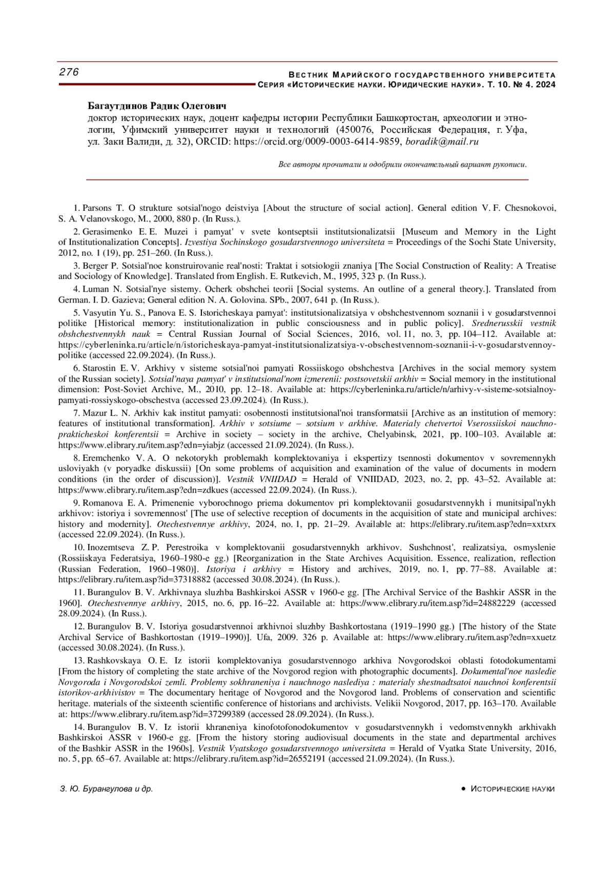 14. Бурангулов Б. В. Из истории хранения кинофотофонодокументов в государственных и ведомственных архивах Башкирской АССР в 1960-е гг. // Вестник Вятского государственного университета. 2016. № 5. С. 65-67. URL: item.asp?id=26552191 (дата обращения: 22.09.2024). EDN: WJBBXD