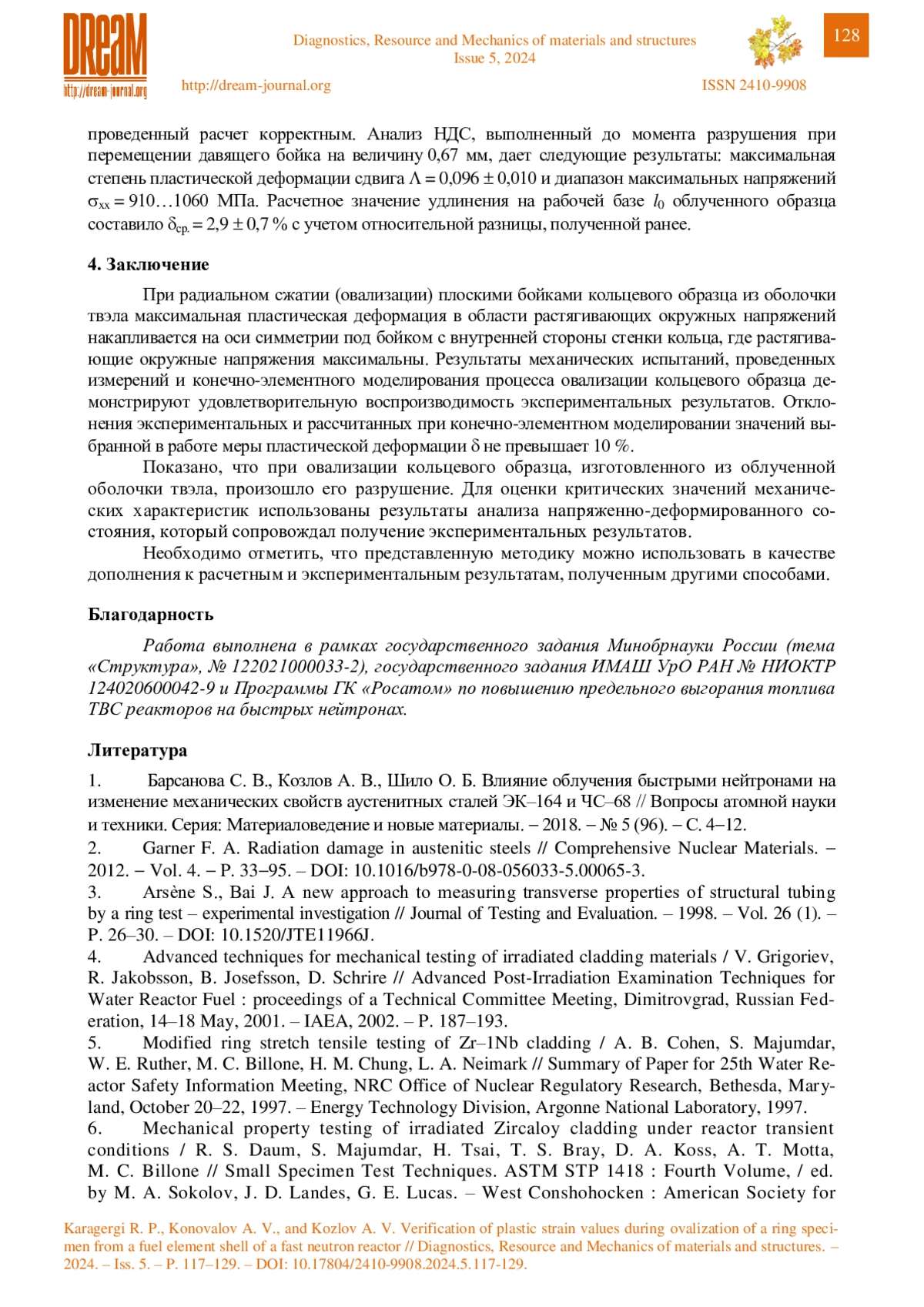 11. Karagergi R. P., Evseev M. V., Kozlov A. V. Distribution of plastic deformation along the perimeter of circular specimen of thin-wall fuel-element cladding during its expansion // Materials Physics and Mechanics. 2021. Vol. 47 (1). – P. 7488. DOI: 10.18149/MPM.4712021_8.