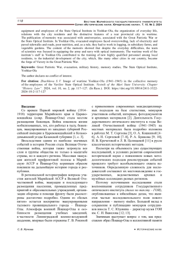 Появление новых методологических подходов в современной исторической науке дает возможность расширить исследовательское поле в изучении памяти современников о событиях Великой Отечественной войны. В годы войны Йошкар-Ола стала местом эвакуации многих академиков и профессоров с мировым именем. В региональной историографии тема восприятия города эвакуированными научными работниками и ведущими учеными не получила должного освещения. Цель статьи - на основе анализа мемуаров сотрудников Государственного оптического института показать образ военной Йошкар-Олы. Предмет исследования - опубликованные воспоминания сотрудников Государственного оптического института (г. Ленинград), пребывавших в эвакуации в годы Великой Отечественной войны (1941-1945) в Йошкар-Оле. Исследование было проведено с применением концепции французского социолога М. Хальбвакса о коллективной памяти. В статье рассмотрены вопросы размещения эвакуированного оборудования и сотрудников Государственного оптического института в Йошкар-Оле, организация их быта, отношения с местными жителями и отличительные особенности тылового провинциального города в военное время. Публикация воспоминаний была сопряжена с юбилейными датами, связанными с Великой Отечественной войной или Государственным оптическим институтом. В Йошкар-Оле эвакуированные сотрудники столкнулись с перенаселением, отсутствием электроэнергии, мощеных тротуаров и дорог, скудным питанием, были вынуждены работать на лесозаготовках, в подсобных хозяйствах, огородах. Несмотря на бытовые сложности, содержание воспоминаний показывает, что коллектив научных сотрудников был сосредоточен на оснащении армии и флота необходимыми оптическими приборами. Работа сотрудников института в Йошкар-Оле военного времени способствовала подготовке новых высококвалифицированных кадров среди местных жителей, промышленному развитию города, который, как и множество других городов нашей страны, стал кузницей Победы в Великой Отечественной войне.