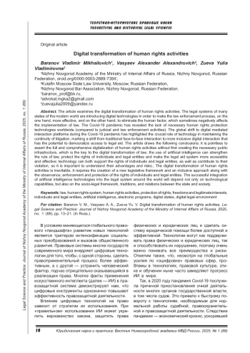 В условиях меняющегося глобального правового «ландшафта» развитие новых технологий является триггером интенсификации социальных преобразований и вызовов общественного развития. Правовые системы многих государств современного мира внедряют цифровые технологии для того, чтобы, с одной стороны, сделать правоприменительный процесс более эффективным, а с другой — устранить человеческий фактор, подчас отрицательно сказывающийся в реализации права. Многие факты применения искусственного интеллекта (далее — ИИ) в правозащитной системе демонстрируют нам, что цифровые инструменты однозначно повышают эффективность правозащитной деятельности.