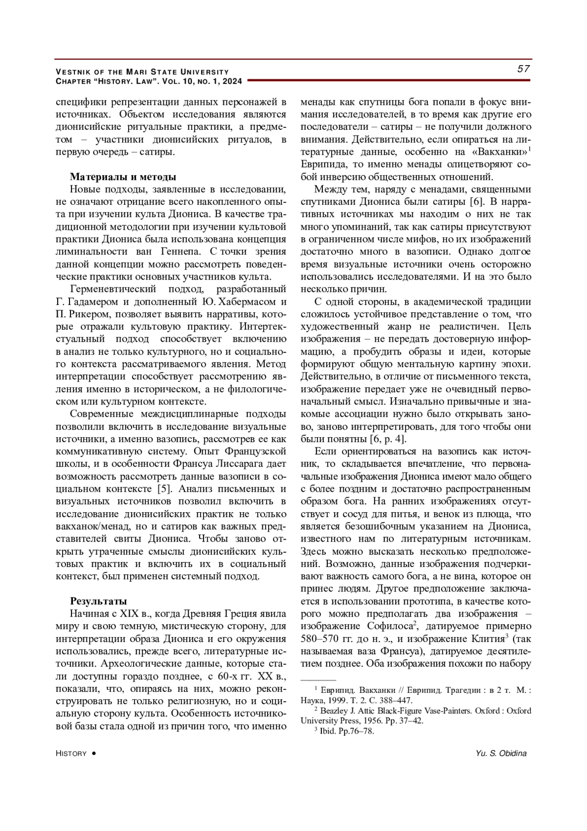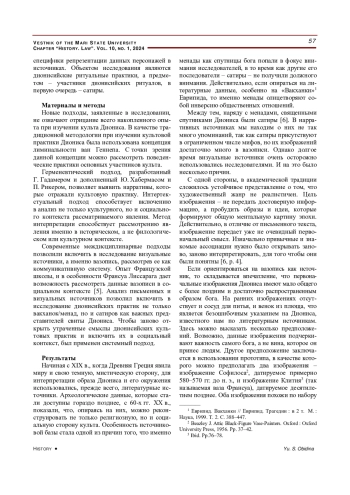 3. Обидина Ю. С. Дионис отверженный? Рецепция культа Диониса в мифологической традиции и полисной религии // Вестник Марийского государственного университета. Серия “Исторические науки. Юридические науки”. 2023. Т. 9. № 2. С. 120-127. DOI: 10.30914/2411-3522-2023-9-2-120-127 EDN: ILJNBS
