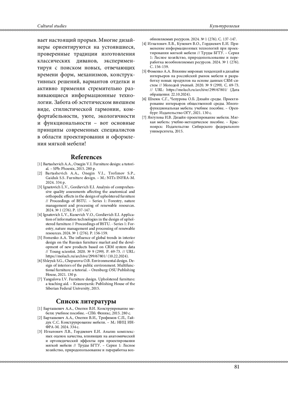 3. Игнатович Л.В., Гордиевич Е.И. Анализ комплексных оценок качества, влияющих на анатомический и ортопедический эффекты при проектировании мягкой мебели // Труды БГТУ. - Серия 1: Лесное хозяйство, природопользование и переработка возобновляемых ресурсов. 2024. № 1 (276). С. 137-147.