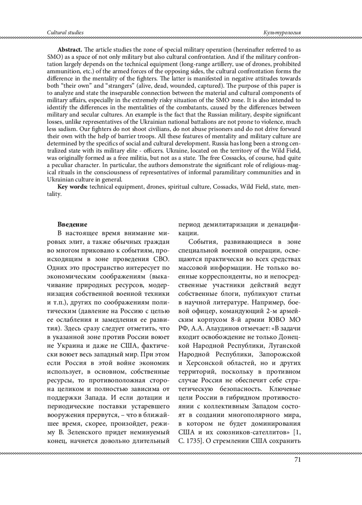В статье исследуется зона специальной военной операции (далее СВО) как пространство не только военного, но и культурного противостояния. И если военное противостояние во многом зависит от технического оснащения (дальнобойная артиллерия, использование дронов, запрещенных боеприпасов и т. п.) вооруженных сил противоборствующих сторон, то культурное формирует разницу менталитетов бойцов. Последнее проявляется в негативном отношении, как к «своим», так и к «чужим» (живым, мертвым, раненым, взятым в плен). Целью данной работы является анализ и констатация неразрывной связи материальной и культурной составляющих военного дела, особенно в предельно рискованной ситуации зоны СВО. Предполагается также выявить разницу в менталитетах участвующих в боевых действиях сторон, порожденную различиями военной и светской культур. Примером является тот факт, что российские военные, несмотря на значительные потери, в отличие от представителей украинских нацбатов не склонны к насилию, тем более садизму. Наши бойцы не расстреливают мирных жителей, не издеваются над пленными и не гонят вперед своих при помощи заградотрядов. Все эти особенности менталитета и военной культуры определяются спецификой общественного и культурного развития. Россия испокон была сильным централизованным государством со своей военной элитой - офицерством. Украина, находящая на территории Дикого Поля, изначально формировалась как вольница, но никак не государство. У вольных казаков, конечно, была достаточно своеобразная культура. В частности, авторы демонстрируют значимую роль религиозно-магических ритуалов в сознании представителей неформальных военизированных сообществ и в украинской культуре в целом.