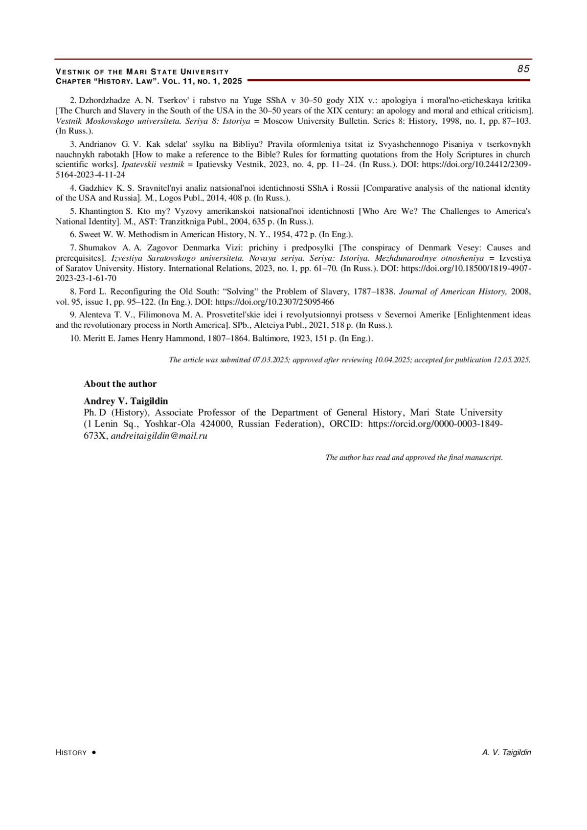 2. Джорджадзе А. Н. Церковь и рабство на Юге США в 30-50 годы XIX в.: апология и морально-этическая критика // Вестник Московского университета. Серия 8: История. 1998. № 1. С. 87-103.