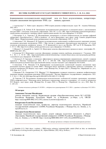 8. Анисимова Т. М., Мальцева Е. В. Формирование исследовательских компетенций младших школьников через реализацию научного кружка на основе ТРИЗ // Начальная школа: проблемы и перспективы, ценности и инновации: сб. статей по материалам XVI Всеросс. науч.-практ. конф. (Йошкар-Ола, 26 марта 2024 г.). Йошкар-Ола: Марийский гос. ун-т, 2024. Вып. 16. С. 23-27. EDN: CAYXSD