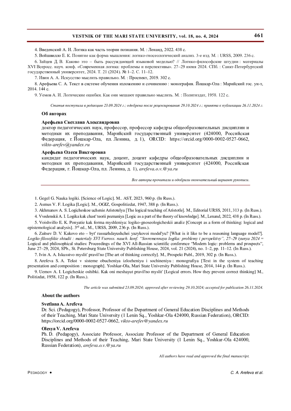 АРЕФЬЕВА С. А., АРЕФЬЕВА О. В. РАЗВИТИЕ ЛОГИЧЕСКОГО МЫШЛЕНИЯ ОБУЧАЮЩИХСЯ В ПРОЦЕССЕ РАБОТЫ С ТЕКСТАМИ РАЗНЫХ ТИПОВ РЕЧИ // ВЕСТНИК МАРИЙСКОГО ГОСУДАРСТВЕННОГО УНИВЕРСИТЕТА. 2024. Т. 18 № 4 (56)