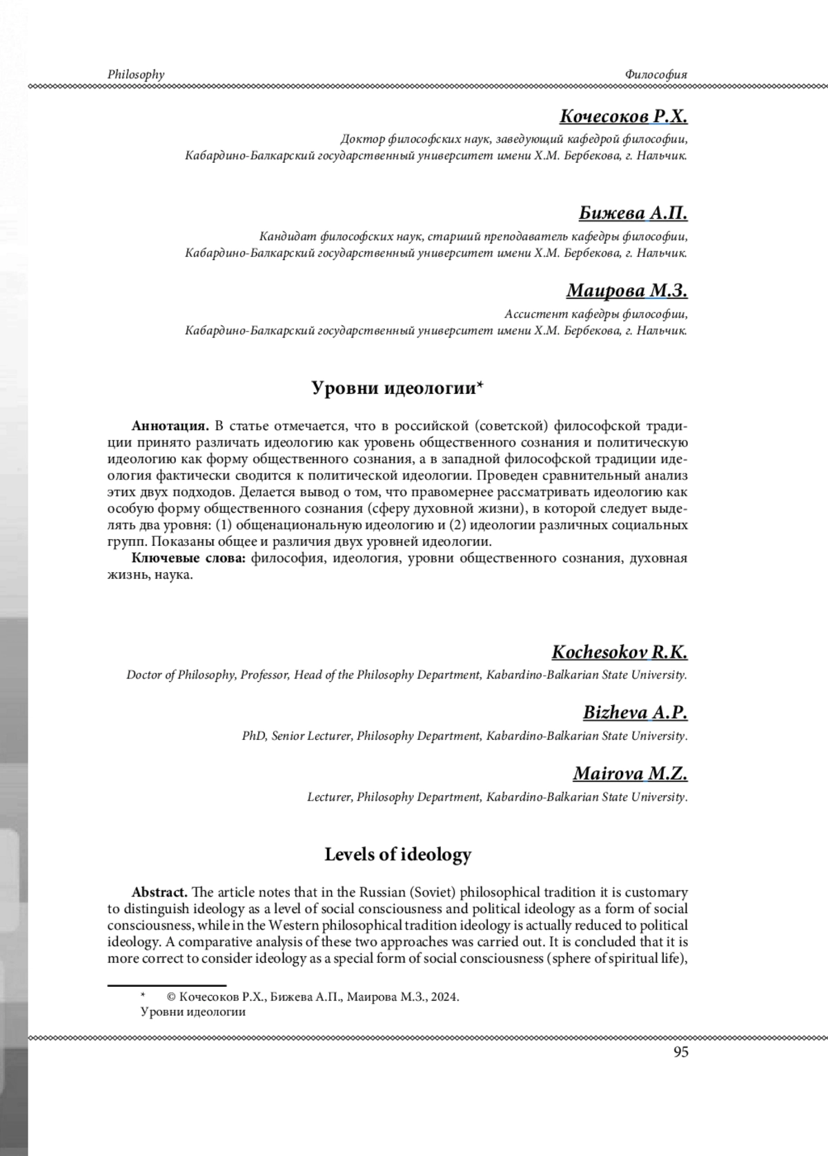 4. Кочесоков Р. Х., Бижева А.П., Маирова М.З. Идеология как особое явление духовной жизни // Миссия конфессий. 2024. Том 13. Часть 6. (№ 79). С. 14-22. EDN: USVUAQ