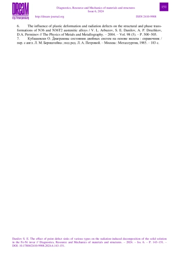 4. Arbuzov V. L., Druzhkov A. P., Danilov S. E. Effects of phosphorus on defects accumula-tion and annealing in electron-irradiated Fe–Ni austenitic alloys // Journal of Nuclear Materials. – 2001. – Vol. 295. – P. 273–280. – DOI: 10.1016/S0022-3115(01)00505-0.