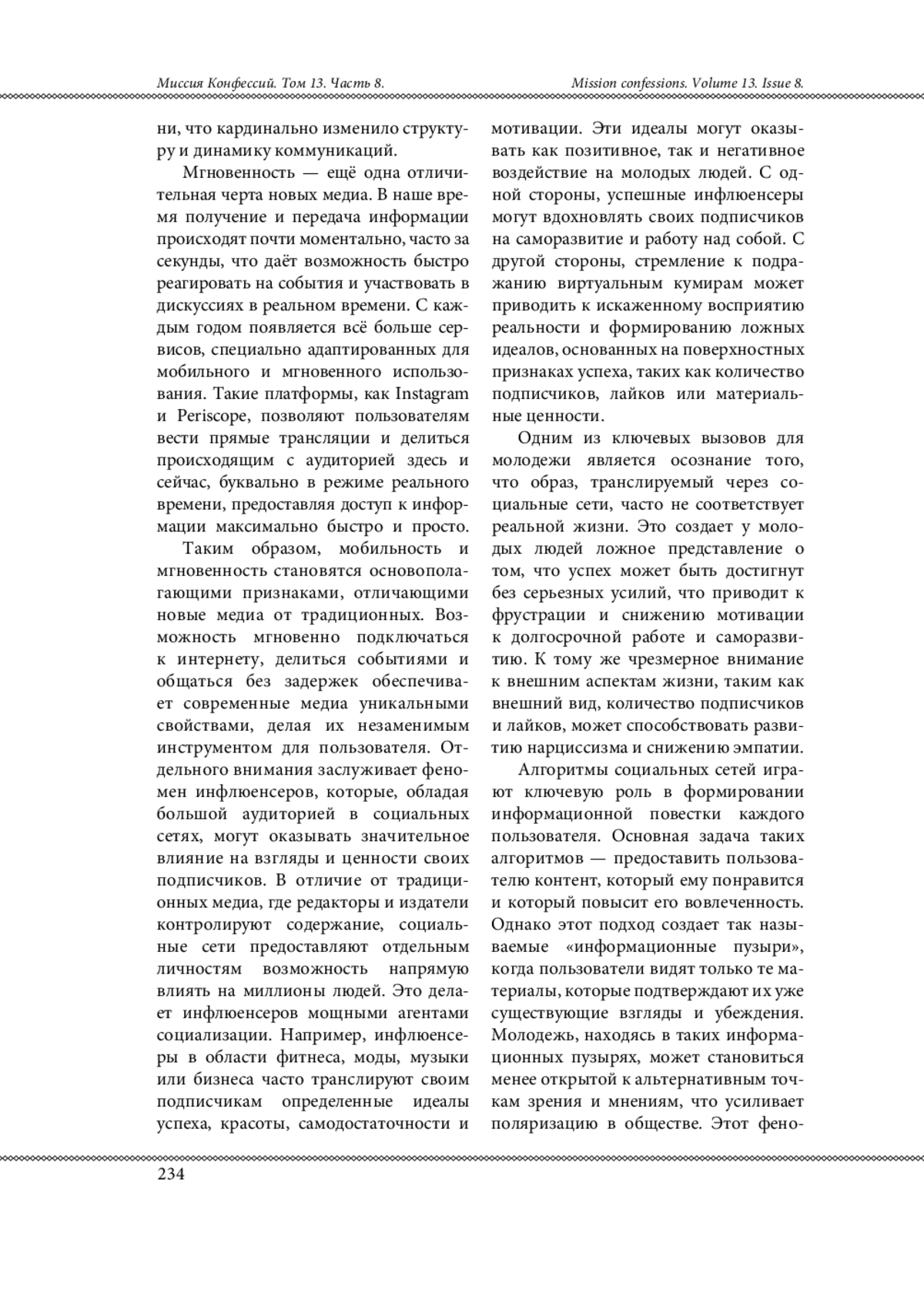 Дано краткое описание влияния социальных сетей на молодежь и их традиционные мировоззренческие ценности. Описаны изменения в процессе социализации молодежи, вызванные диджитализацией и использованием социальных медиа. Рассмотрены роль инфлюенсеров, проблемы информационных пузырей и поляризации мнений, а также влияние на потребительскую культуру и политическую активность. Предложены пути решения возникающих проблем для минимизации негативных последствий через развитие медиаграмотности, критического мышления и разумности потребления.