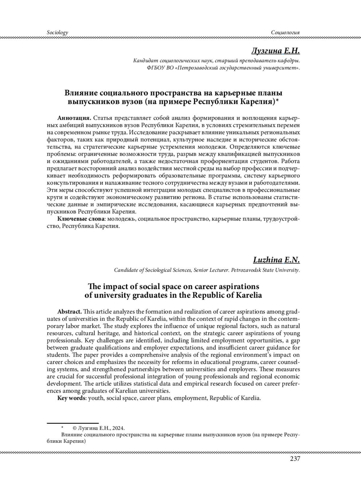 Статья представляет собой анализ формирования и воплощения карьерных амбиций выпускников вузов Республики Карелия, в условиях стремительных перемен на современном рынке труда. Исследование раскрывает влияние уникальных региональных факторов, таких как природный потенциал, культурное наследие и исторические обстоятельства, на стратегические карьерные устремления молодежи. Определяются ключевые проблемы: ограниченные возможности труда, разрыв между квалификацией выпускников и ожиданиями работодателей, а также недостаточная профориентация студентов. Работа предлагает всесторонний анализ воздействия местной среды на выбор профессии и подчеркивает необходимость реформировать образовательные программы, систему карьерного консультирования и налаживание тесного сотрудничества между вузами и работодателями. Эти меры способствуют успешной интеграции молодых специалистов в профессиональные круги и содействуют экономическому развитию региона. В статье использованы статистические данные и эмпирические исследования, касающиеся карьерных предпочтений выпускников Республики Карелия.