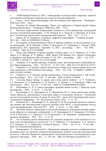 13. Vladimirov A. P. Dynamic speckle interferometry of high-cycle material fatigue: theory and some experiments // AIP Conference Proceedings. – 2016. – Vol. 1740. – P. 040004-1–040004-4. – DOI: 10.1063/1.4952663.