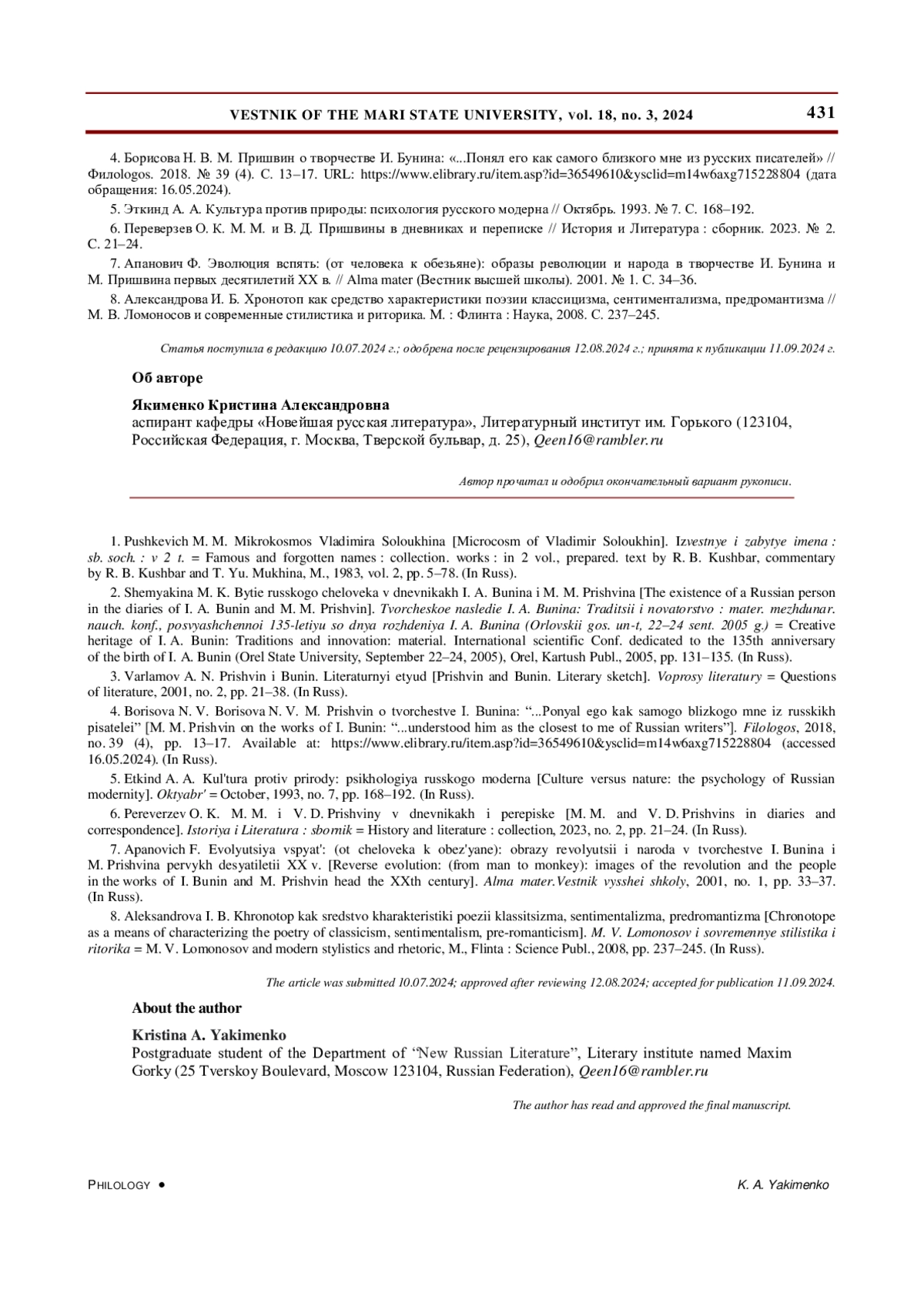4. Борисова Н. В. М. Пришвин о творчестве И. Бунина: “..Понял его как самого близкого мне из русских писателей” // Филоlogos. 2018. № 39 (4). С. 13-17. URL: https://www.elibrary.ru/item.asp?id=36549610&ysclid=m14w6axg715228804 (дата обращения: 16.05.2024).