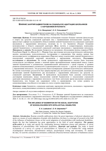 Материалы и методы. Исследование базируется на материалах обследования группы учащихся ГБОУ Республики Марий Эл «Школа № 1 г. Йошкар-Олы» при помощи методов педагогического наблюдения, анализа документации, психологического тестирования и социометрии. Для анализа данных был использован расчет коэффициентов корреляции (Пирсона) между показателями занятий бадминтоном и показателями социальной адаптации школьников с нарушениями интеллекта. Результаты исследования и обсуждения. На основе проведенного корреляционного анализа были получены статистически достоверные данные о наличии прямо пропорциональных взаимосвязей между стажем занятий бадминтоном и успешностью соревновательной деятельности с одной стороны, и уровнем развития коммуникативных склонностей и социометрическим статусом - с другой, в группе школьников с нарушениями интеллекта. Эти результаты были подтверждены данными педагогического наблюдения. На основе полученных результатов был сформулирован ряд методических рекомендаций, касающихся организации занятий бадминтоном для школьников с нарушениями интеллекта как средства их социальной адаптации.