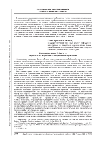 И. Кант является мыслителем, чье идейное наследие о человеке и праве, праве и морали, правовом государстве и правовом сознании, конституции и конституционализме и т. п. активно используются в зависимости от контекста, конъюнктуры, цивилизационной идентичности и ситуативной интерпретации людьми самых разных взглядов (принимая, что кантовские «философские идеи и государственно-правовые воззрения сложно анализировать ввиду бесчисленного количества ответвлений его концепции. Государственно-правовые взгляды мыслителя рассеяны в его многочисленных трудах, посвященных этике, эстетике и философии).