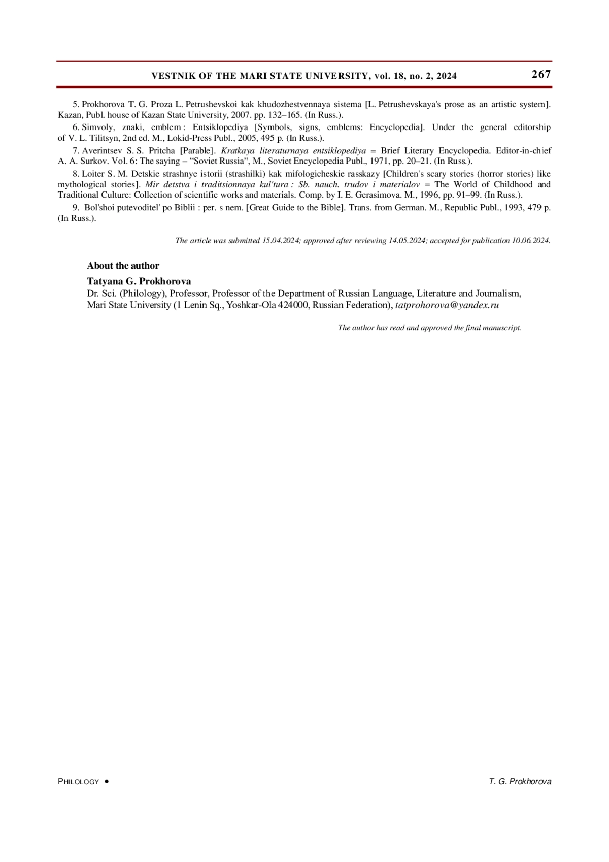 5. Прохорова Т. Г. Проза Л. Петрушевской как художественная система. Казань: Казанский гос. ун-т, 2007. С. 132-165. EDN: QTGOIV
