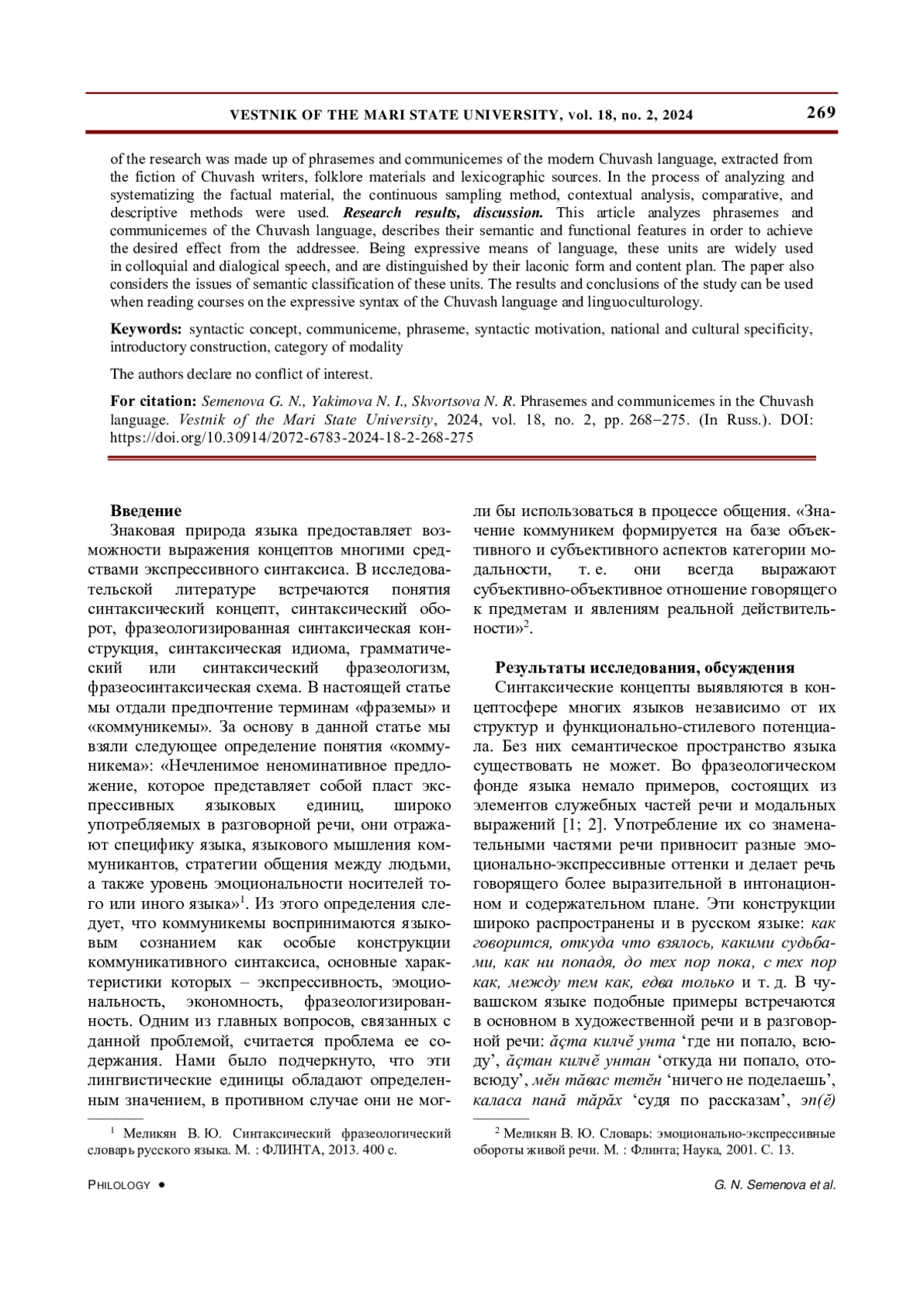 СЕМЕНОВА Г. Н., ЯКИМОВА Н. И., СКВОРЦОВА Н. Р. ФРАЗЕМЫ И КОММУНИКЕМЫ В ЧУВАШСКОМ ЯЗЫКЕ // ВЕСТНИК МАРИЙСКОГО ГОСУДАРСТВЕННОГО УНИВЕРСИТЕТА. 2024. Т. 18 № 2 (54)