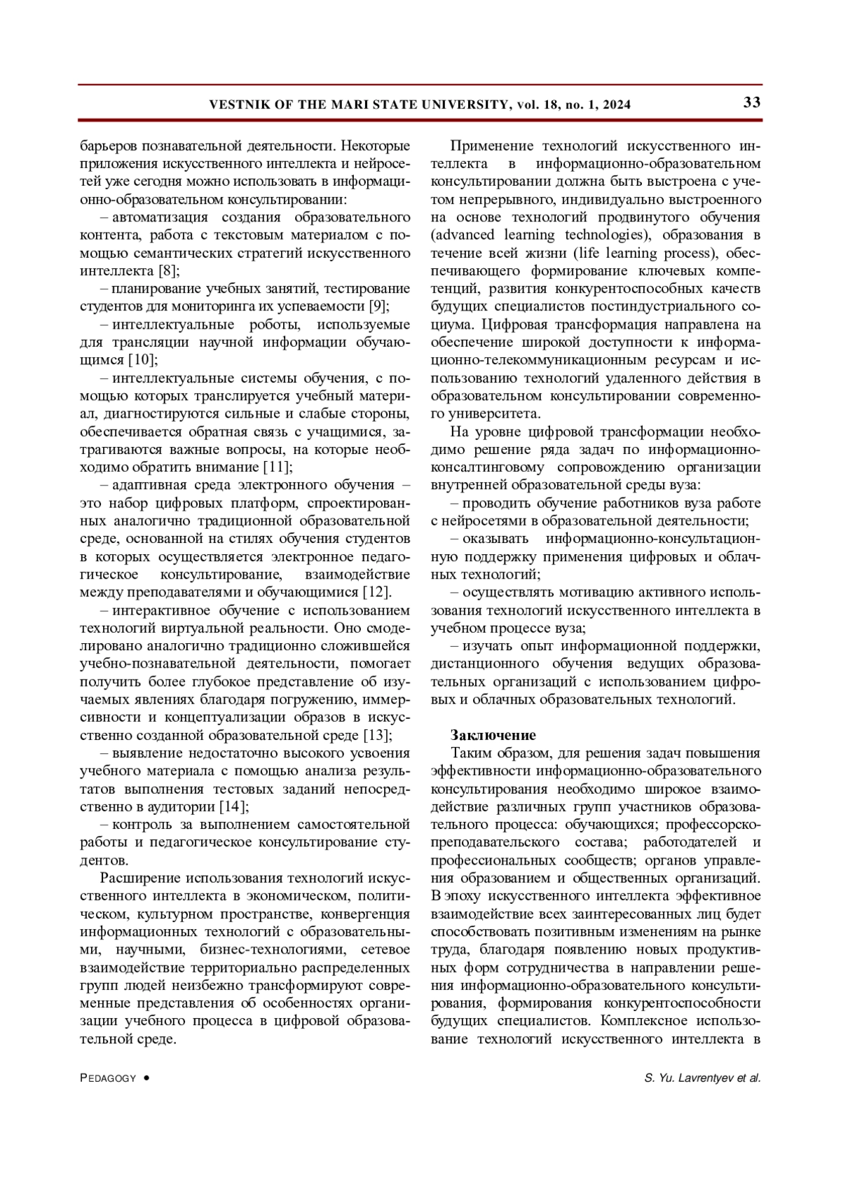 Повышение интереса к технологиям искусственного интеллекта на фоне цифровой трансформации, с одной стороны, и потребности в информационно-образовательном консультировании ‒ с другой, является на сегодняшний день актуальным объектом философских, социальноэкономических, психолого-педагогических, технолого-технических исследований. В стратегических документах развития общества основанного на знаниях, обозначенных в национальном проекте «Образование», федеральных проектах: «Цифровая школа» и «Учитель будущего», а также «Стратегии развития информационного общества РФ на 2017–2030 годы», сформулированы направления реализации образовательных программ, внедрение цифровых средств обучения, развитие конкурентоспособности российского образования. В рамках реализации Указа Президента Российской Федерации от 15.02.2024 № 124 внесены изменения Национальной стратегии развития искусственного интеллекта в Российской Федерации на период до 2030 года1.