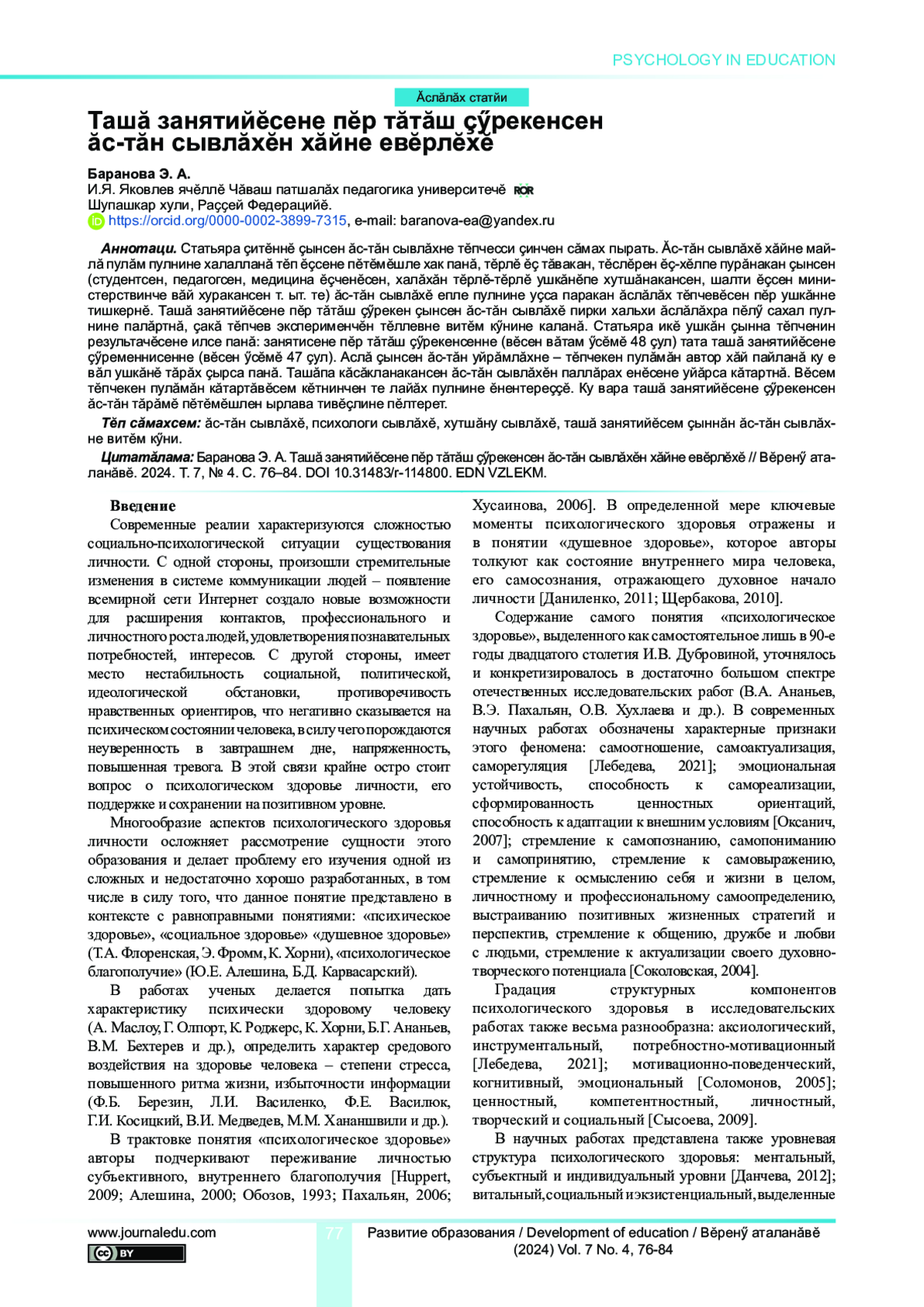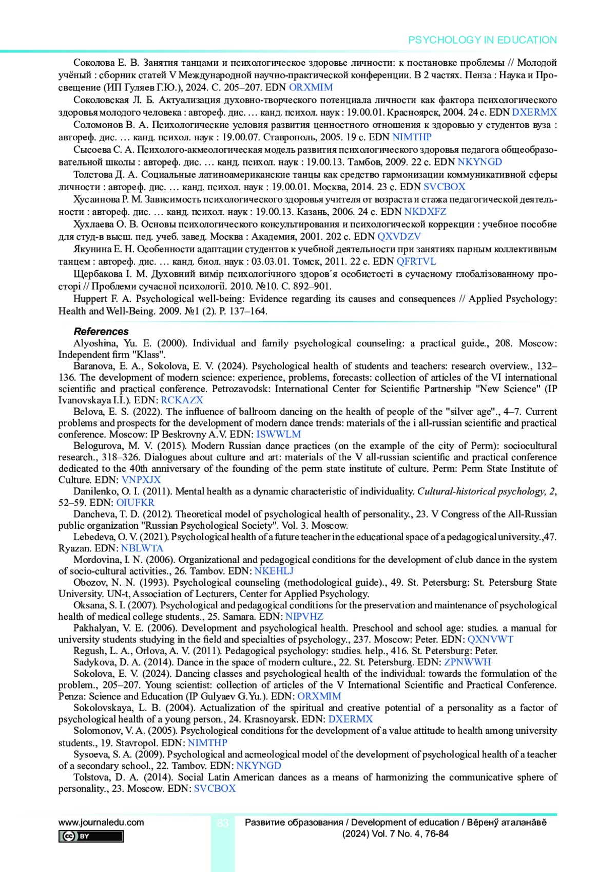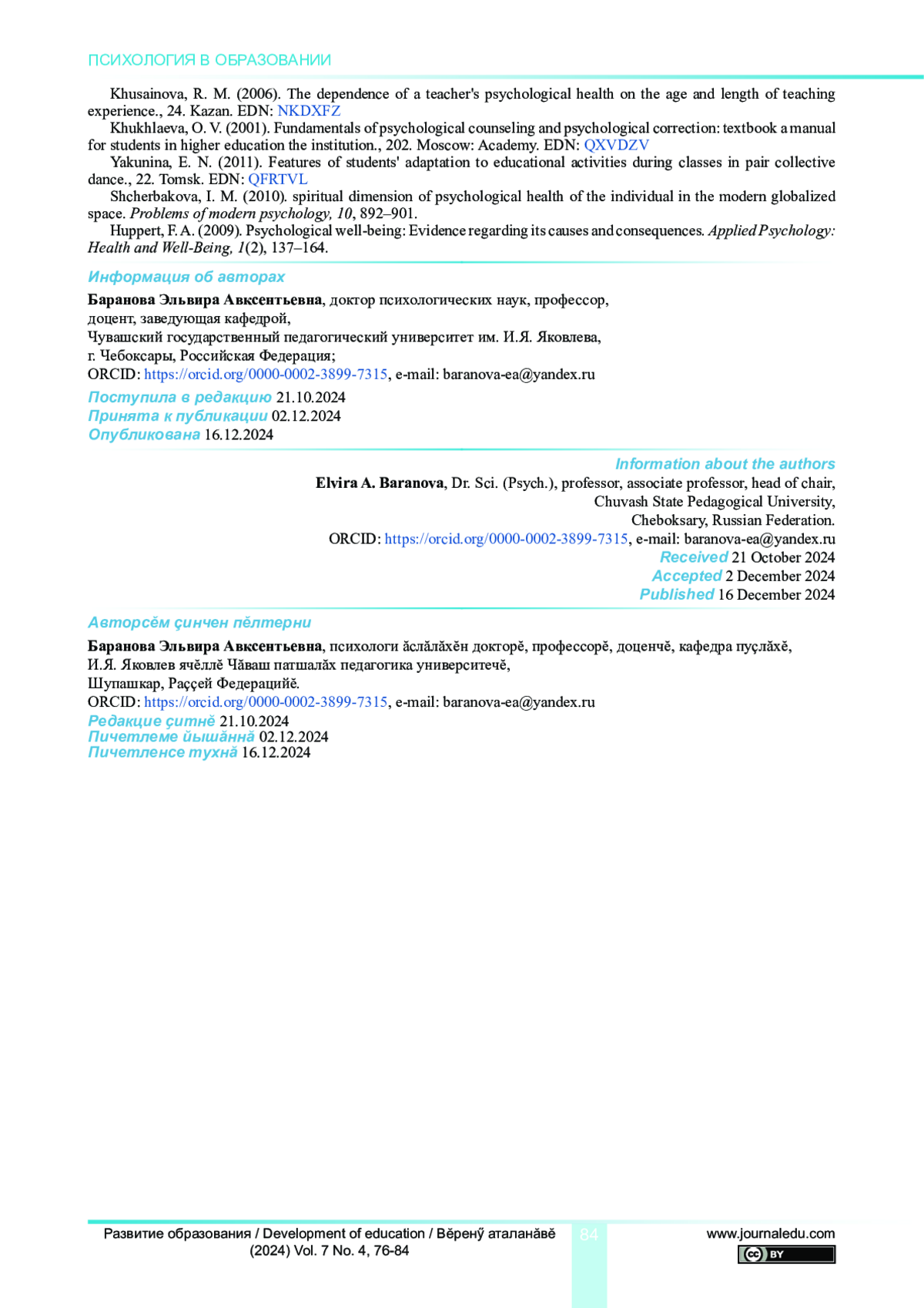 2. Баранова Э. А., Соколова Е. В. Психологическое здоровье студентов и педагогов: обзор исследований // Развитие современной науки: опыт, проблемы, прогнозы: сборник статей VI Международной научно-практической конференции. Петрозаводск: Международный центр научного партнерства “Новая Наука” (ИП Ивановская И.И.), 2024. С. 132-136. EDN: RCKAZX