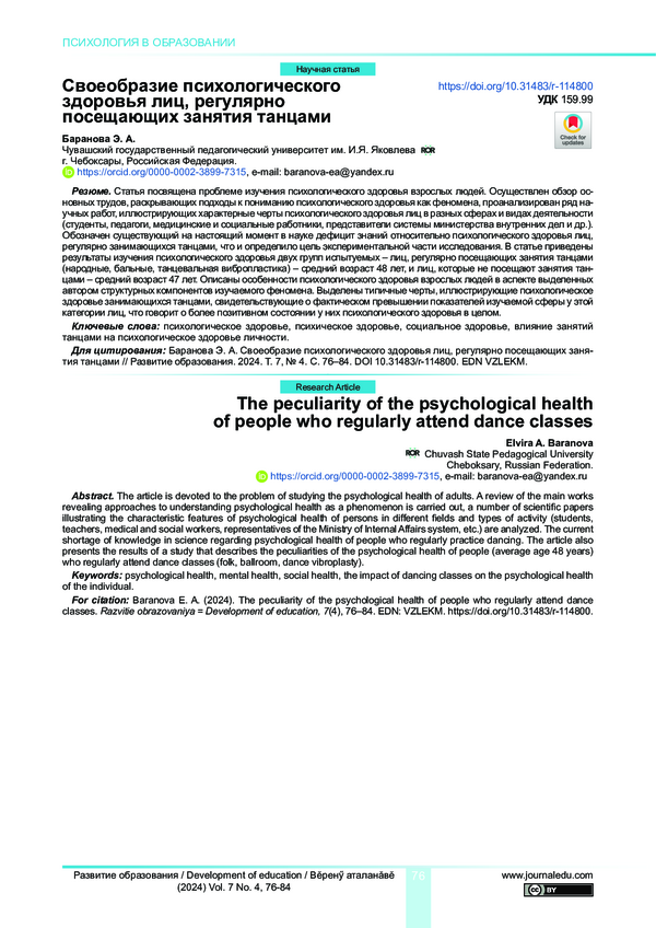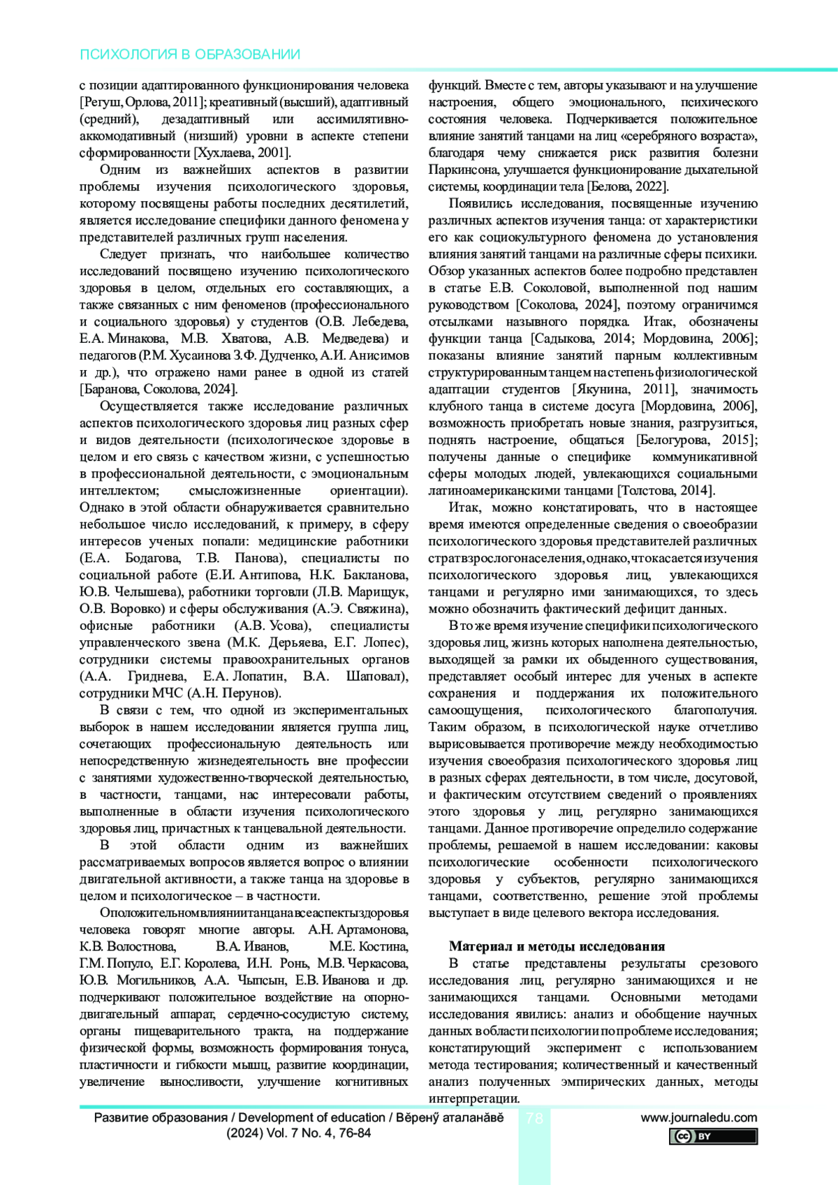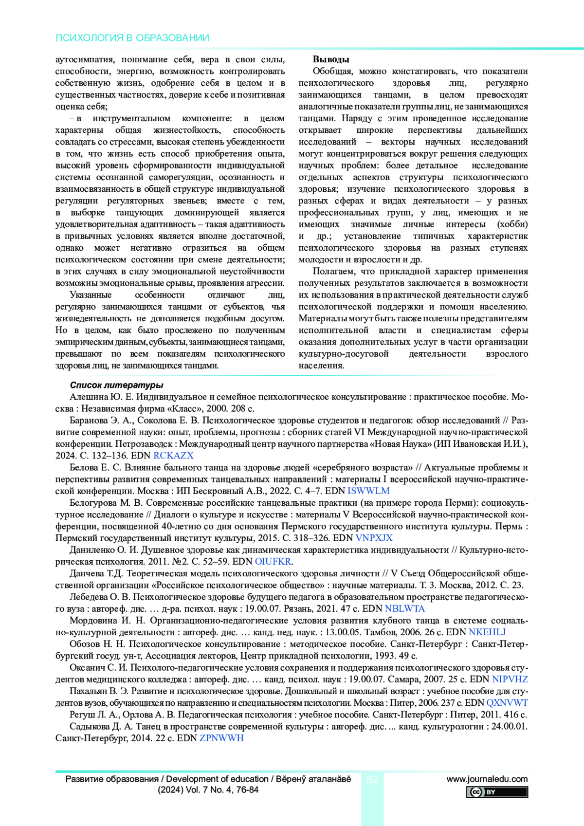 2. Баранова Э. А., Соколова Е. В. Психологическое здоровье студентов и педагогов: обзор исследований // Развитие современной науки: опыт, проблемы, прогнозы: сборник статей VI Международной научно-практической конференции. Петрозаводск: Международный центр научного партнерства “Новая Наука” (ИП Ивановская И.И.), 2024. С. 132-136. EDN: RCKAZX
