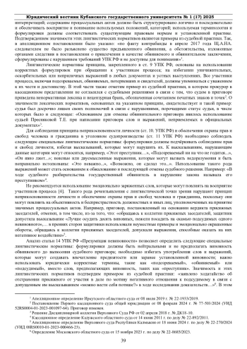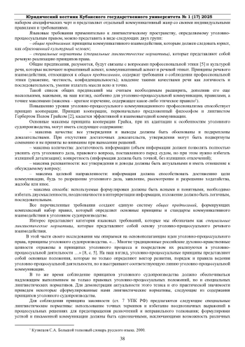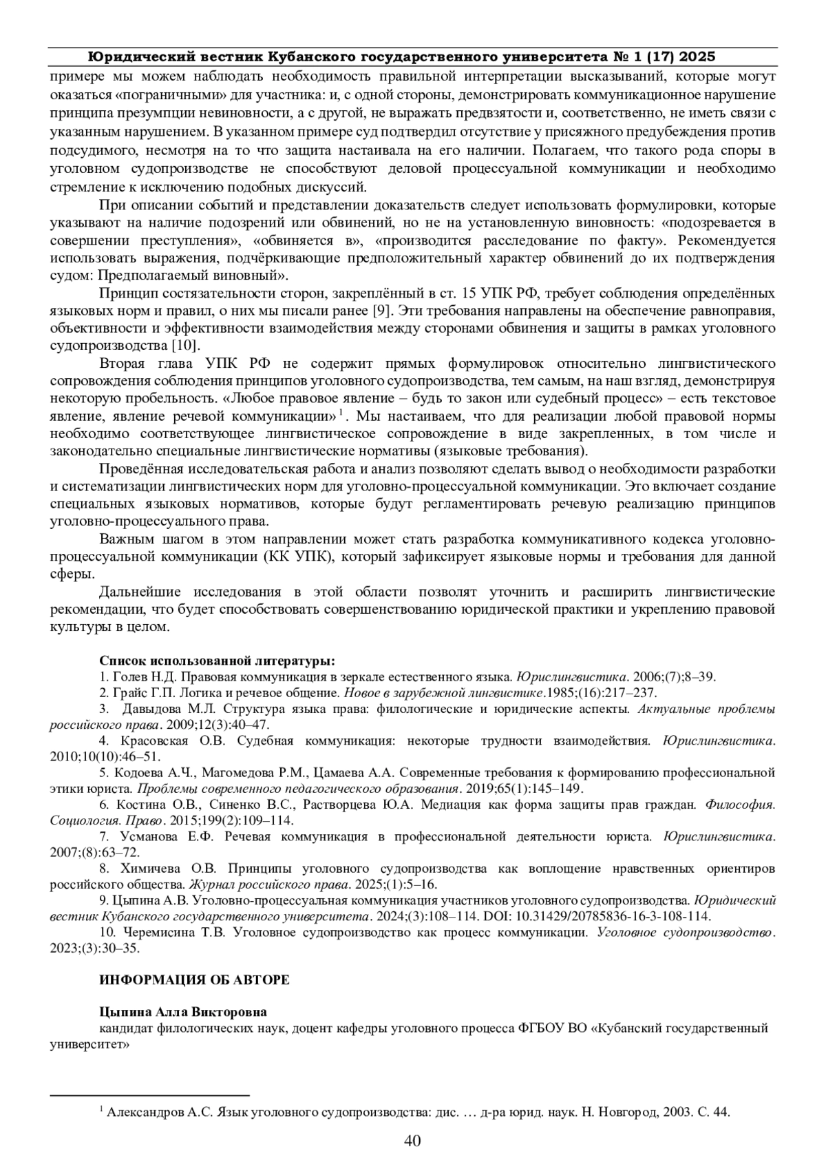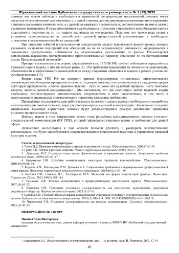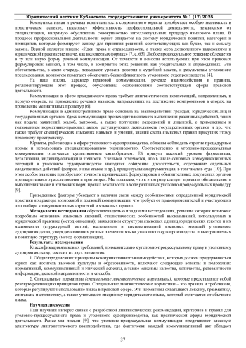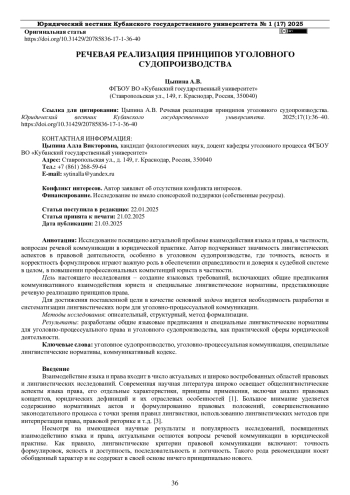 Исследование посвящено актуальной проблеме взаимодействия языка и права, в частности, вопросам речевой коммуникации в юридической практике. Автор подчеркивает значимость лингвистических аспектов в правовой деятельности, особенно в уголовном судопроизводстве, где точность, ясность и корректность формулировок играют важную роль в обеспечении справедливости и доверия к судебной системе в целом, в повышении профессиональных компетенций юриста в частности.