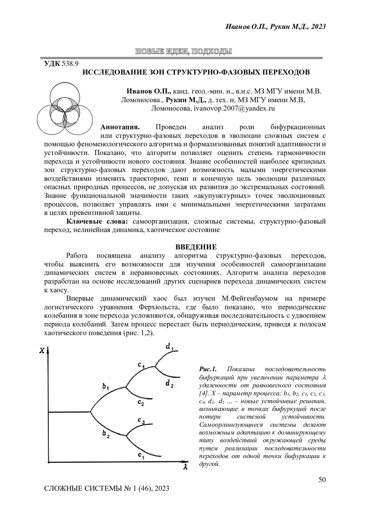 Проведен анализ роли бифуркационных или структурно-фазовых переходов в эволюции сложных систем с помощью феноменологического алгоритма и формализованных понятий адаптивности и устойчивости. Показано, что алгоритм позволяет оценить степень гармоничности перехода и устойчивости нового состояния. Знание особенностей наиболее кризисных зон структурно-фазовых переходов дают возможность малыми энергетическими воздействиями изменить траекторию, темп и конечную цель эволюции различных опасных природных процессов, не допуская их развития до экстремальных состояний. Знание функциональной значимости таких «акупунктурных» точек эволюционных процессов, позволяет управлять ими с минимальными энергетическими затратами в целях превентивной защиты.