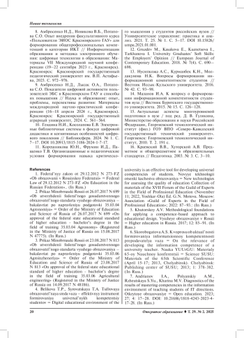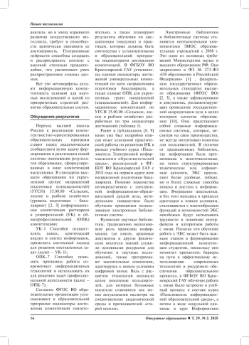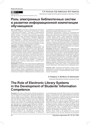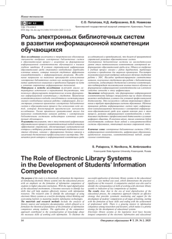 ПОТАПОВА С. О., АМБРОСЕНКО Н. Д., НОВИКОВА В. Б. РОЛЬ ЭЛЕКТРОННЫХ БИБЛИОТЕЧНЫХ СИСТЕМ В РАЗВИТИИ ИНФОРМАЦИОННОЙ КОМПЕТЕНЦИИ ОБУЧАЮЩИХСЯ // ОТКРЫТОЕ ОБРАЗОВАНИЕ. 2025. ТОМ 29, № 2