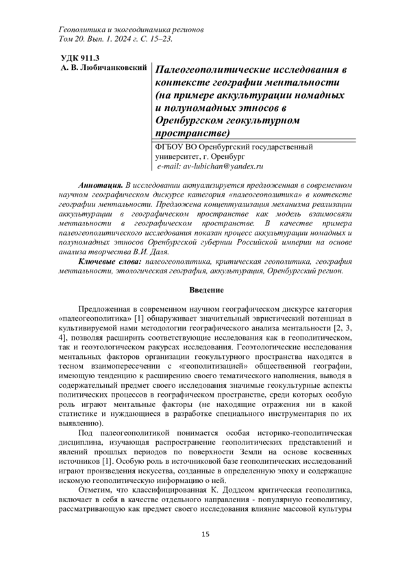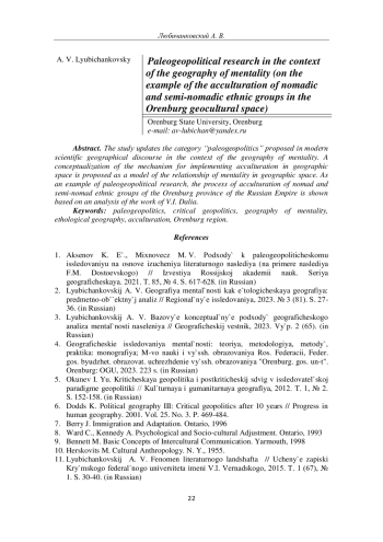 В исследовании актуализируется предложенная в современном научном географическом дискурсе категория «палеогеополитика» в контексте географии ментальности. Предложена концептуализация механизма реализации аккультурации в географическом пространстве как модель взаимосвязи ментальности в географическом пространстве. В качестве примера палеогеополитического исследования показан процесс аккультурации номадных и полуномадных этносов Оренбургской губернии Российской империи на основе анализа творчества В. И. Даля.