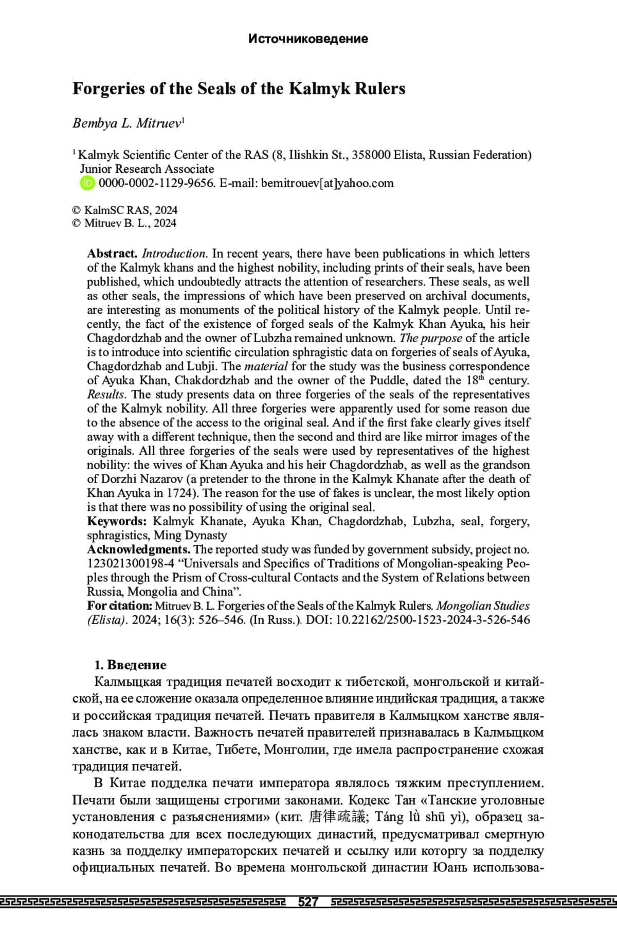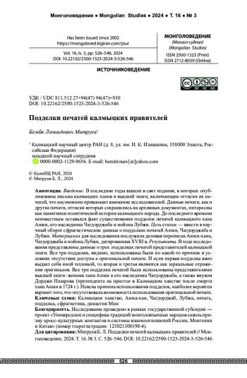13. Митруев 2023а - Митруев Б. Л. О печатях калмыцкого хана Дондук-Омбо // Монголоведение. Т. 15. № 3. С. 419-429. https://doi.org/10.22162/2500-1523-2023-3-419-429