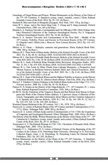 14. Митруев 2023б - Митруев Б. Л. Письмо Убаши-хана из монастыря Лабранг в свете данных тибетских источников о связях калмыков с духовными иерархами // Бюллетень Калмыцкого научного центра РАН. 2023. № 1. С. 8-43. https://doi.org/10.22162/2587-6503-2023-1-25-8-43