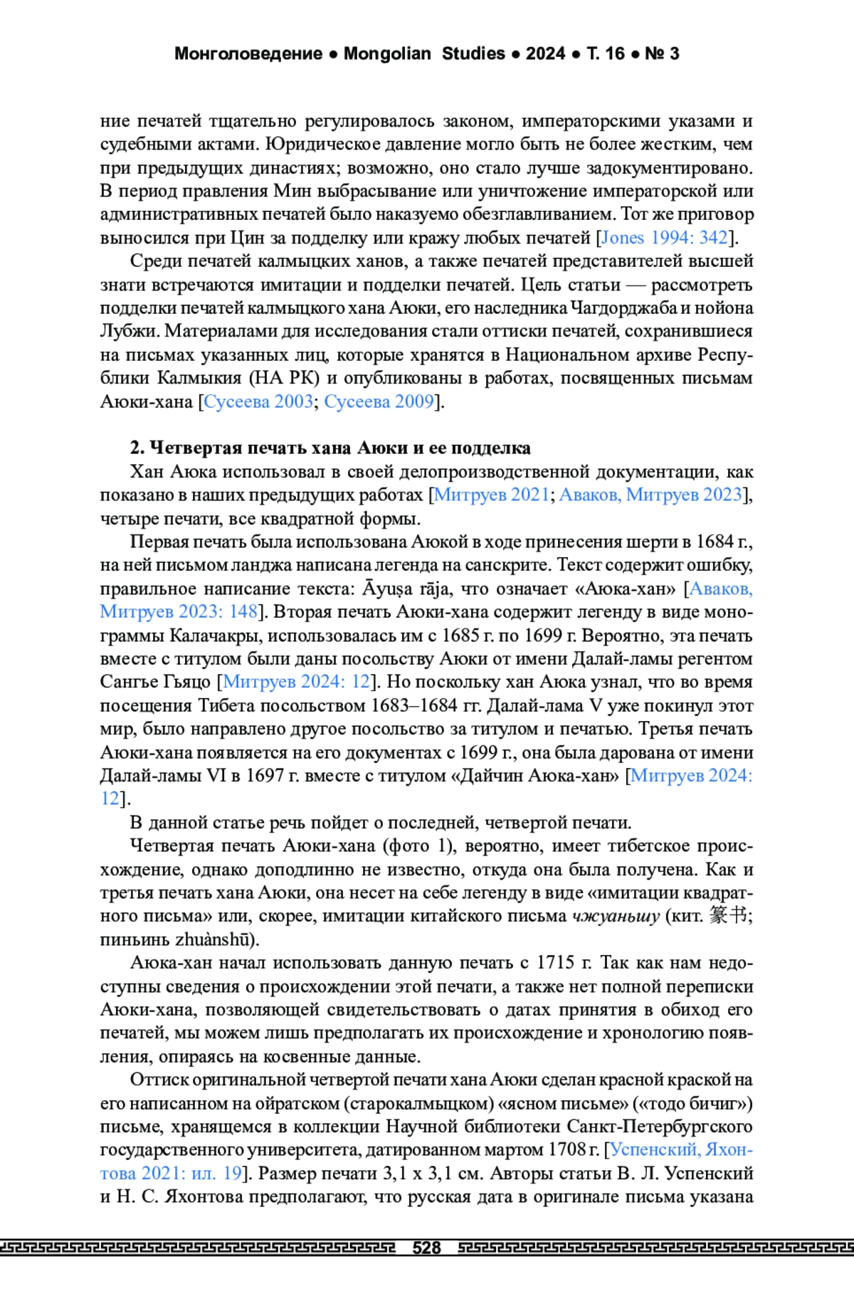 11. Митруев 2021 - Митруев Б. Л. Три печати Аюки-хана // Бюллетень Калмыцкого научного центра РАН. 2021. № 4. С. 44-61. https://doi.org/10.22162/2587-6503-2021-4-20-44-61