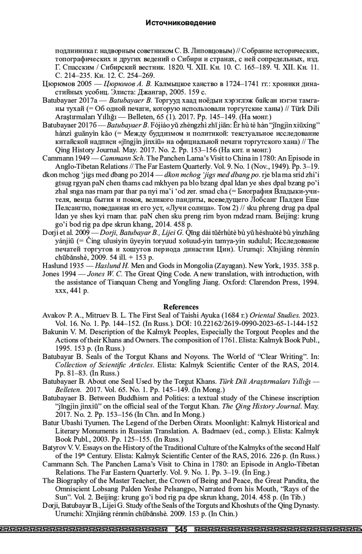2. Аваков, Митруев 2023 - Аваков П. А., Митруев Б. Л. Первая печать тайши Аюки (1684 г.) // Oriental Studies. 2023. Т. 16. № 1. С. 144-152. https://doi.org/10.22162/2619-0990-2023-65-1-144-152