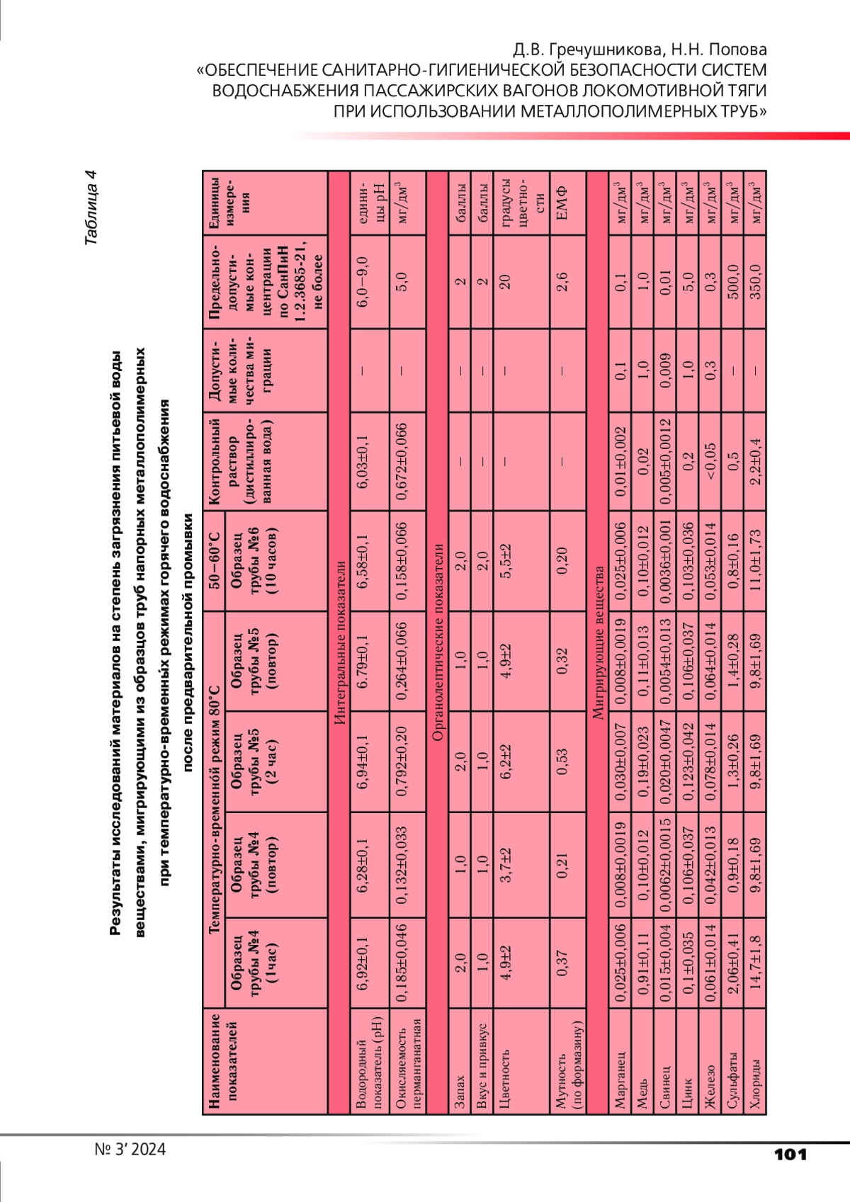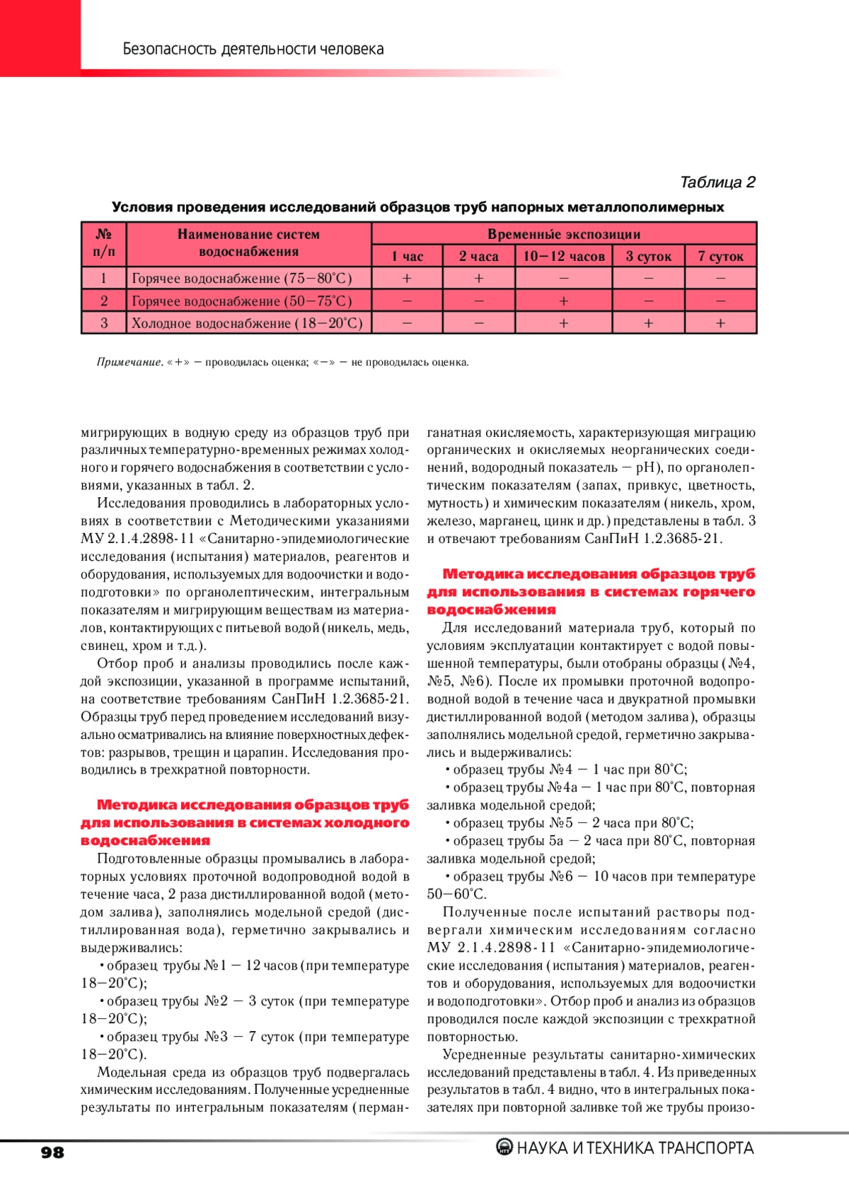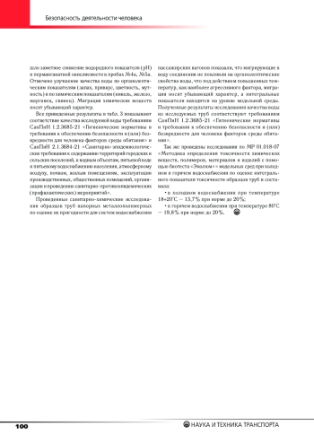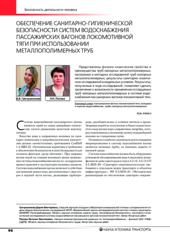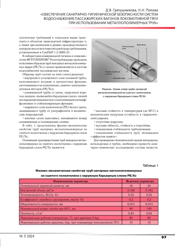 Представлены физико-химические свойства и преимущества труб напорных металлополимерных; программа и методика исследований труб напорных металлополимерных; результаты санитарно-химических исследований в модельных условиях. Результаты, полученные в ходе исследований, позволяют сделать заключение о возможности применения исследуемых труб напорных металлополимерных в системе водоснабжения пассажирских вагонов локомотивной тяги.